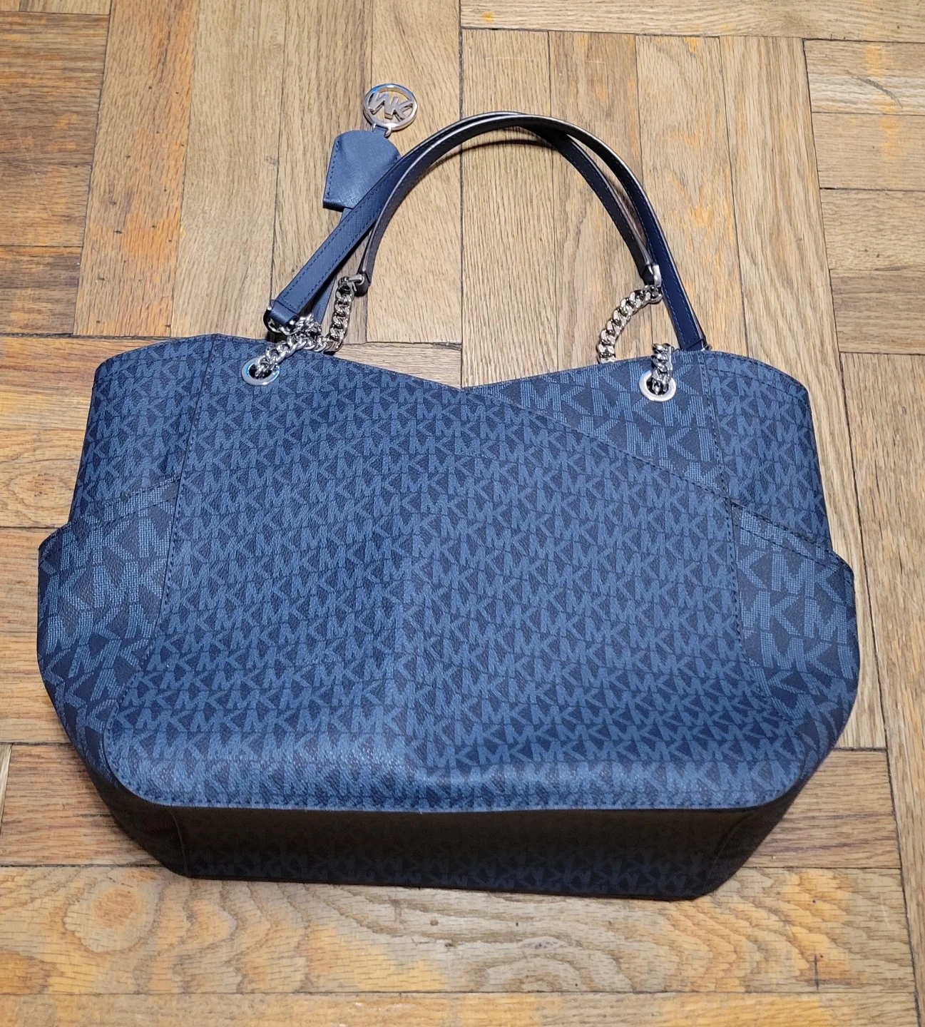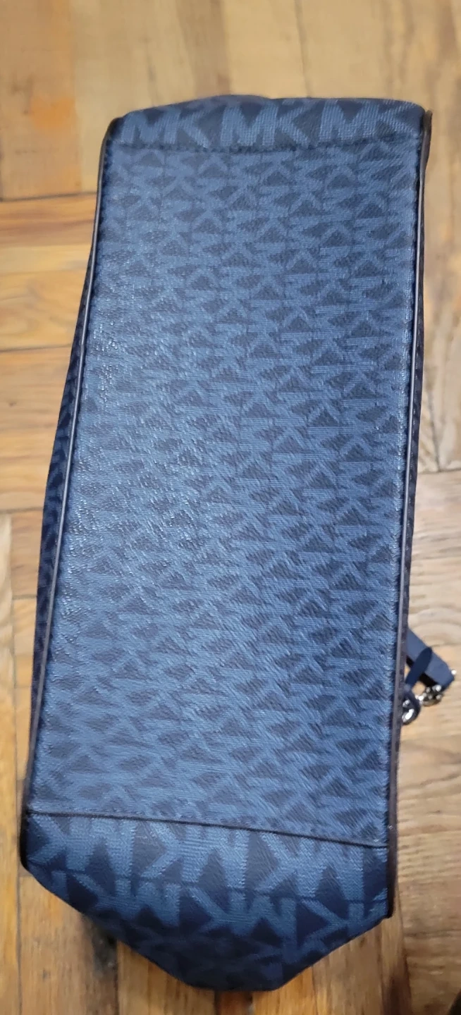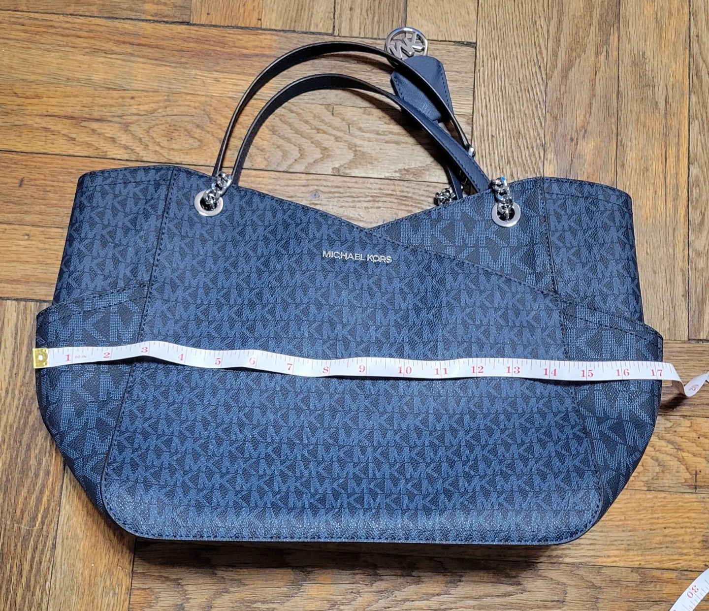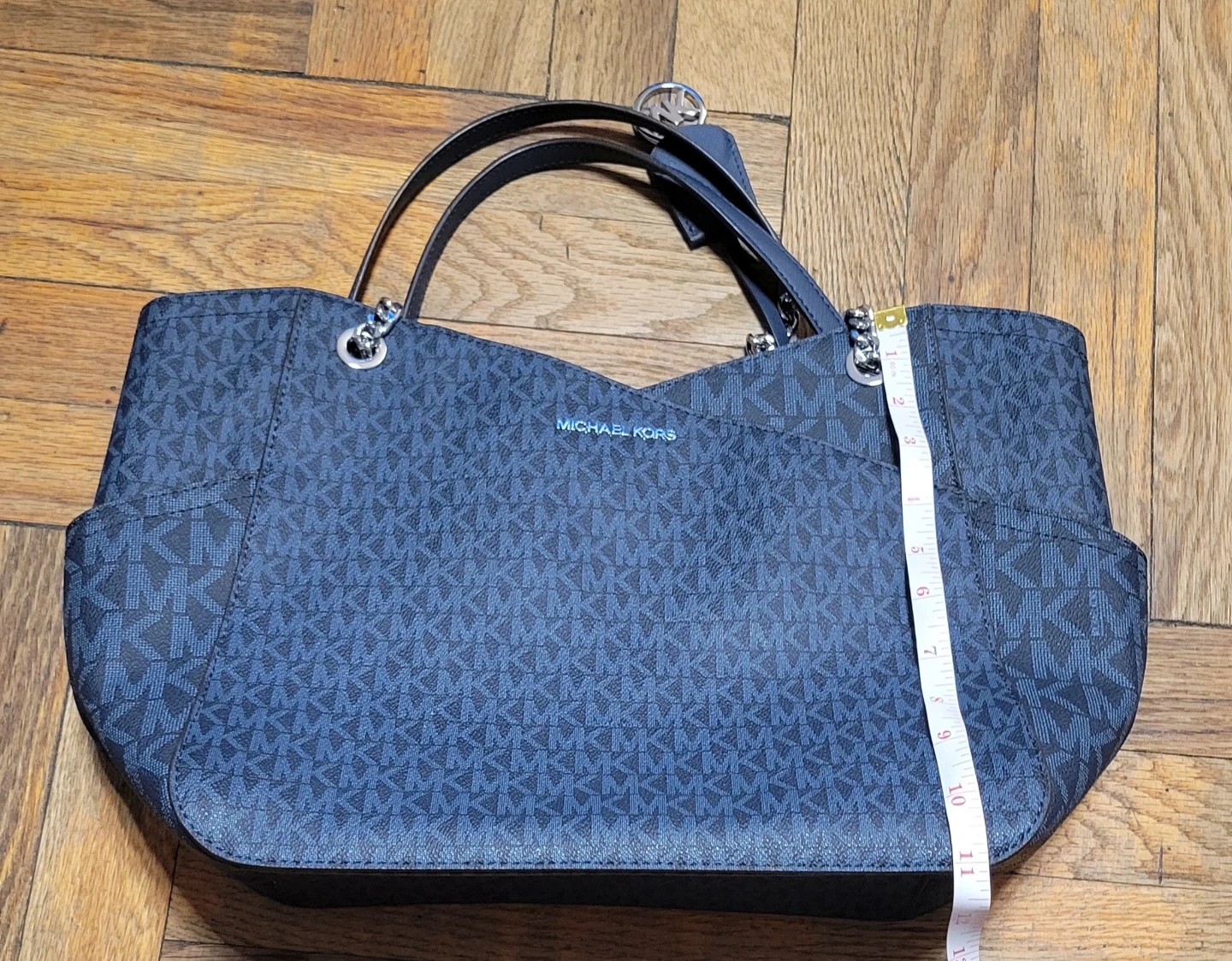 Classic Michael Kors tote bag with all-over MK logo print. Navy blue color. This spacious tote measures approximately 16 inches wide and 11 inches tall. It's perfect for everyday use or travel!
