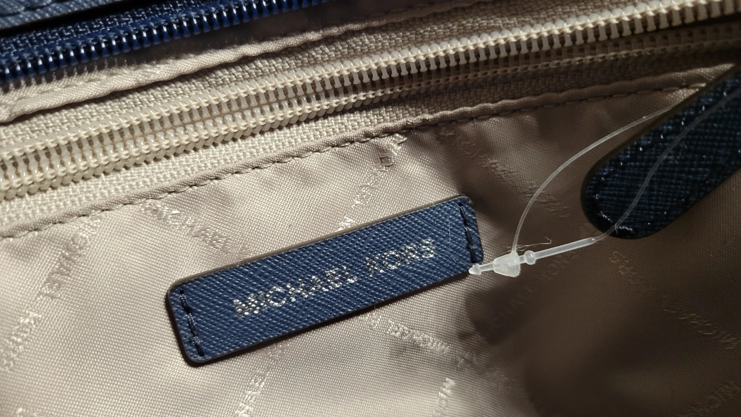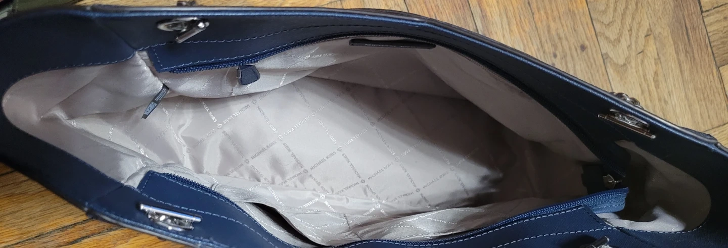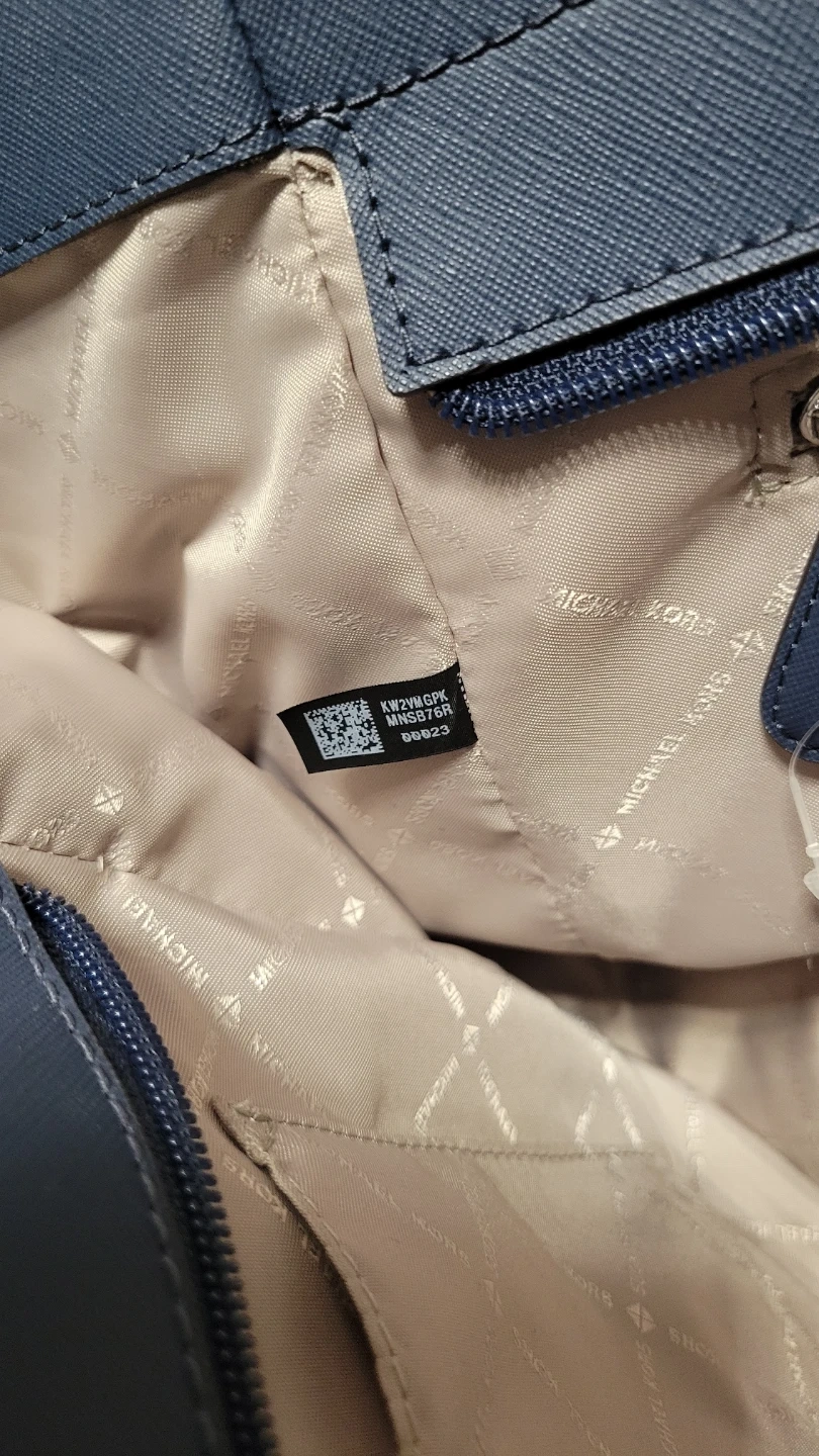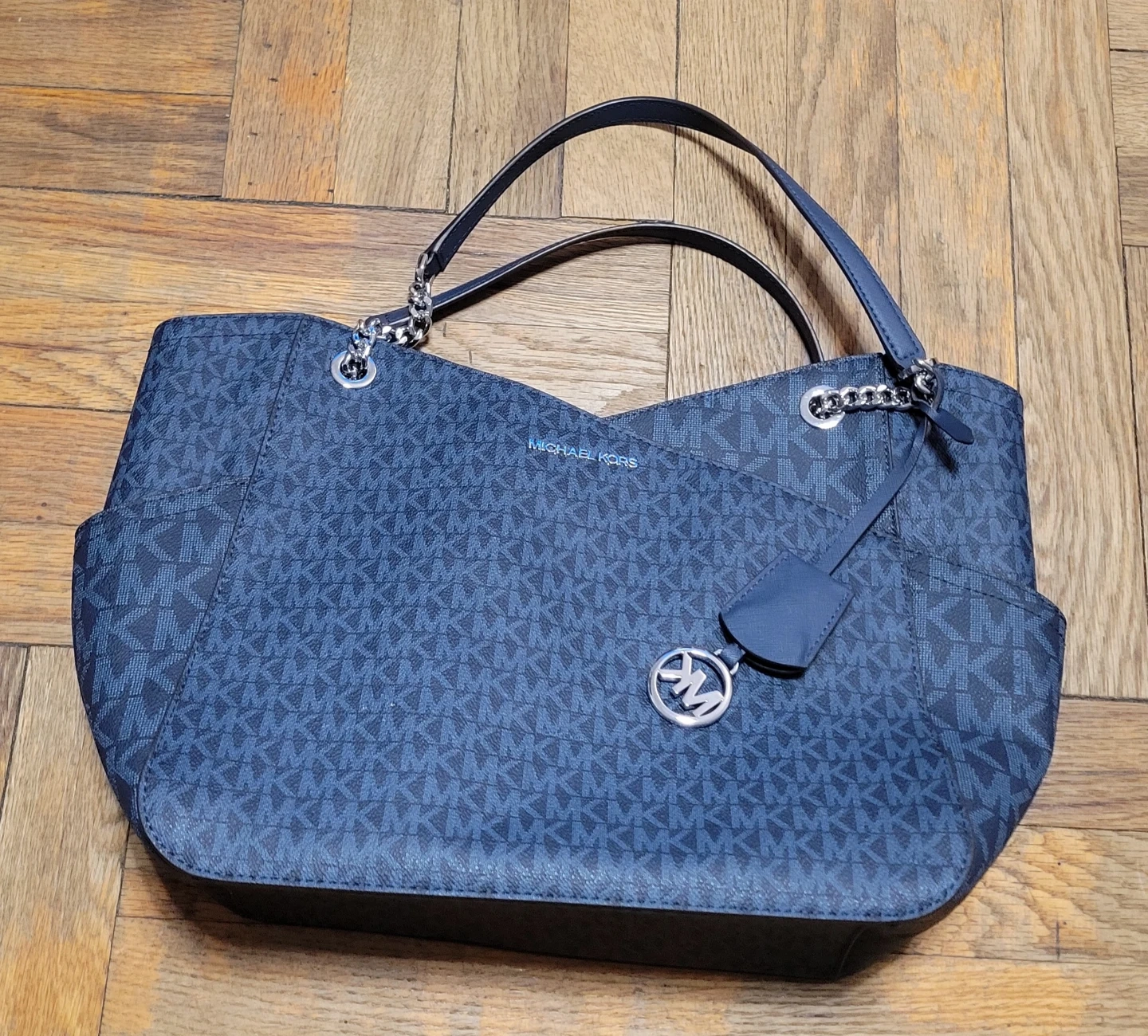 Classic Michael Kors tote bag with all-over MK logo print. Navy blue color. This spacious tote measures approximately 16 inches wide and 11 inches tall. It's perfect for everyday use or travel!