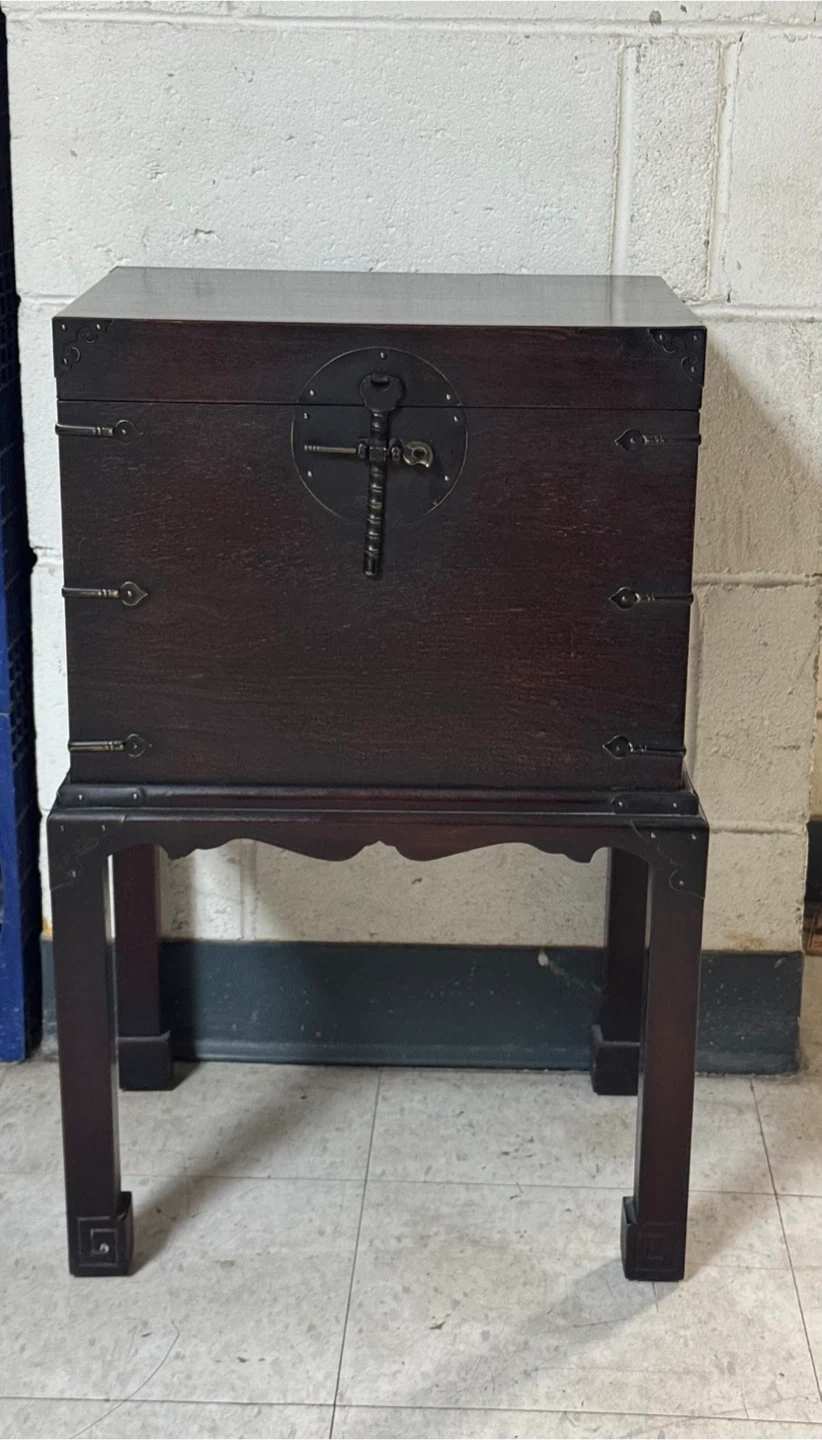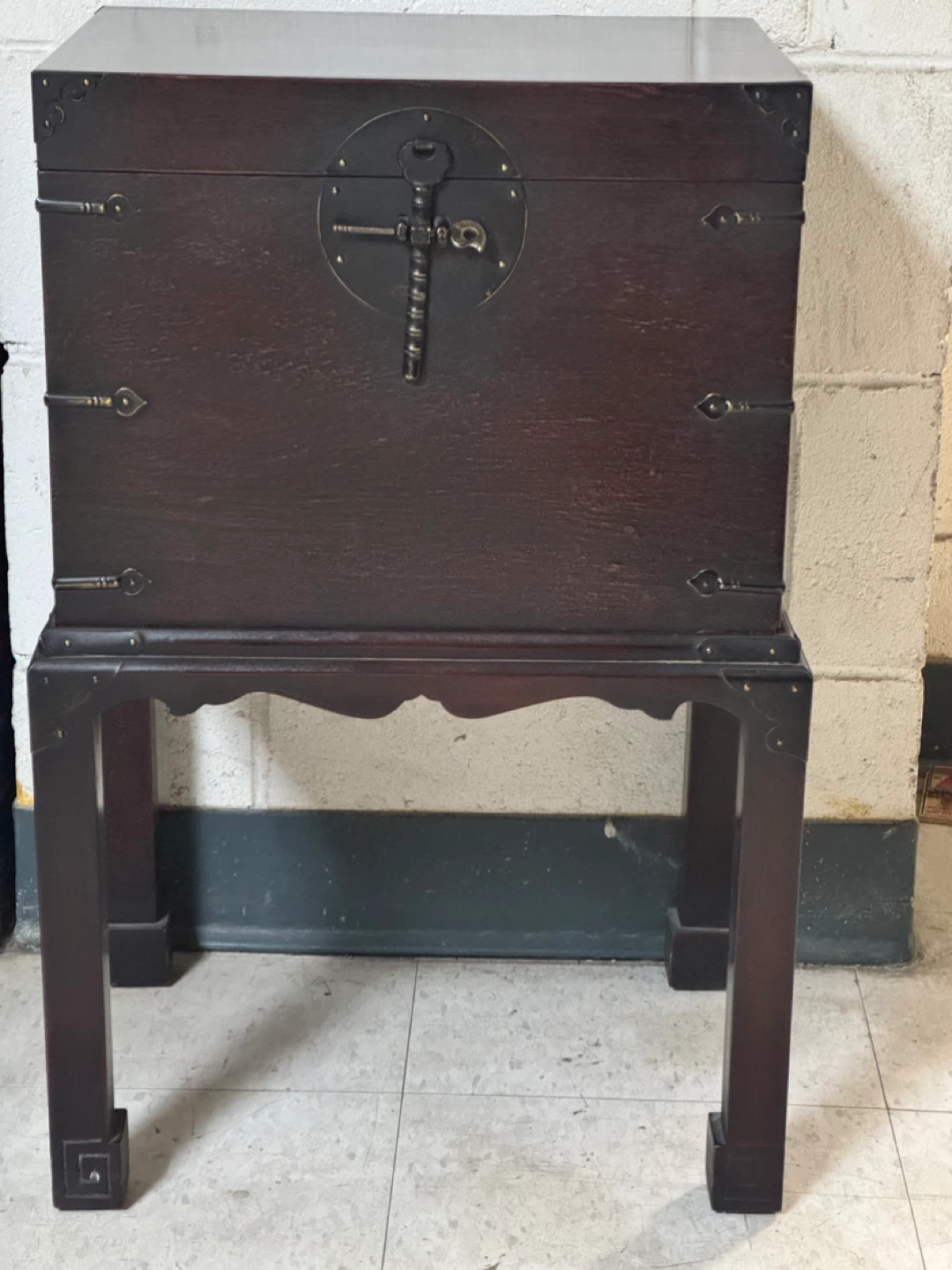 Selling a stunning antique Korean Tansu chest that comes with its original stand. This timeless piece adds a touch of elegance and history to any space. It features traditional handcrafted metalwork and a rich, dark wood finish.