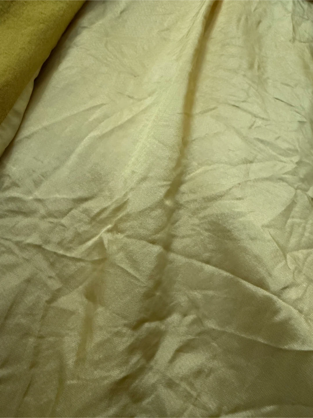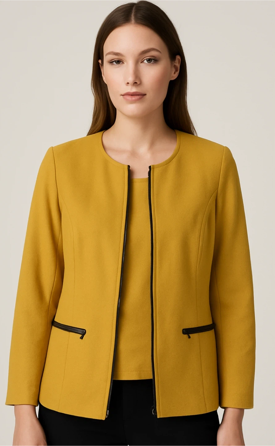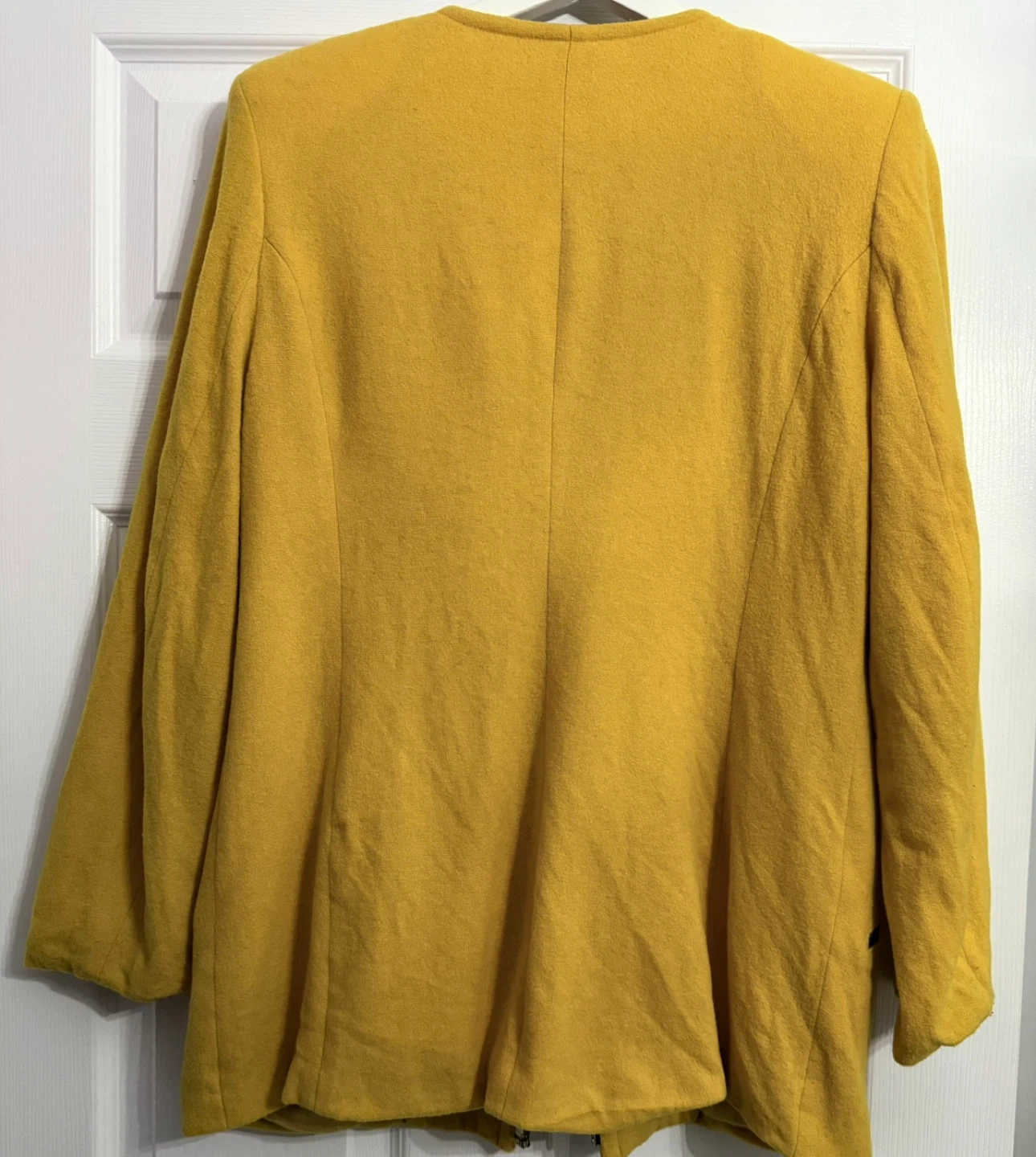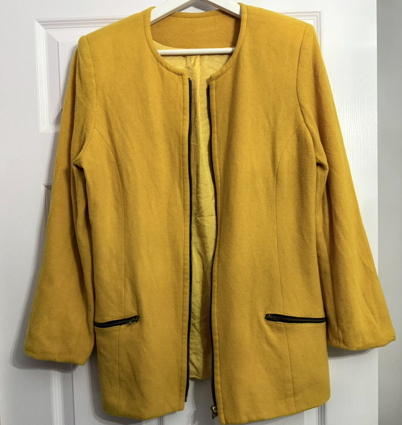 A stylish yellow blazer, perfect for adding a pop of colour to your wardrobe! It features a zipper closure and two small pockets. The blazer is in good condition and ready for a new home