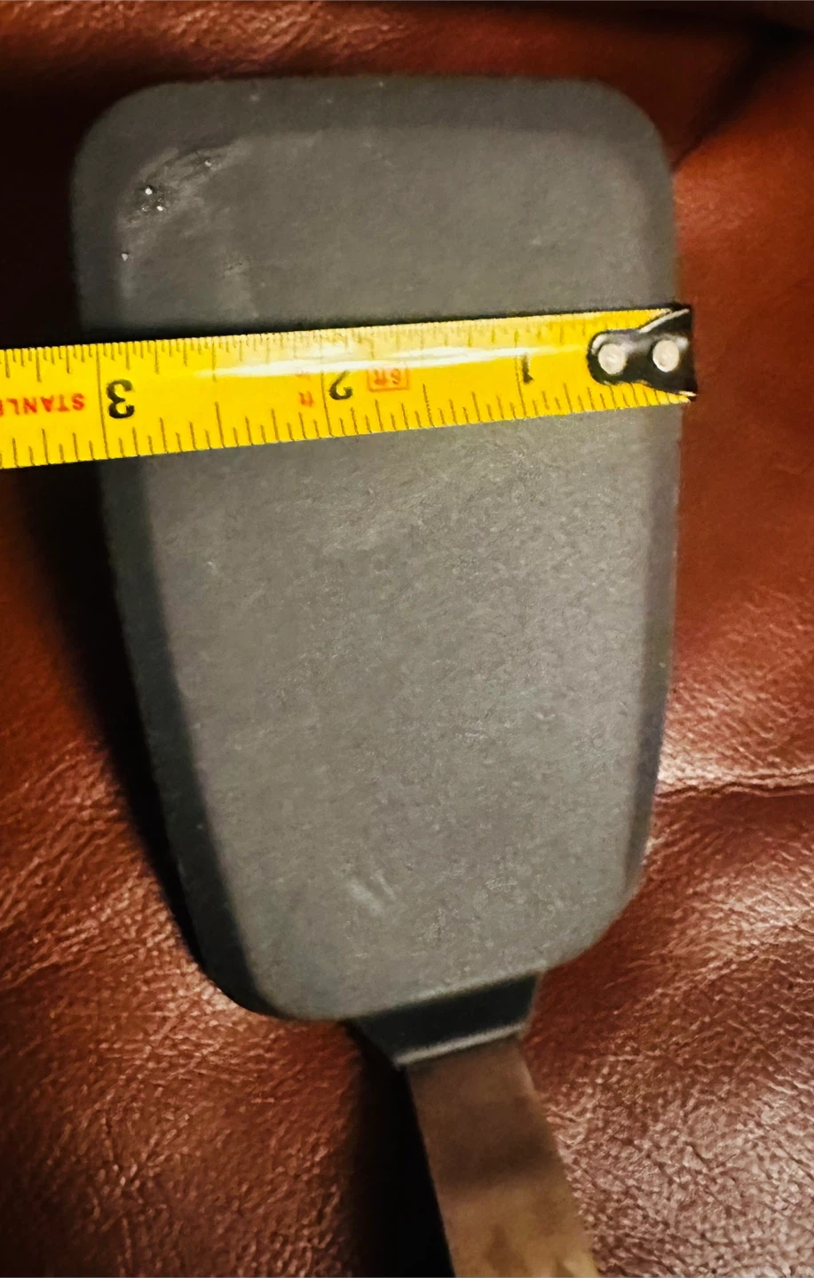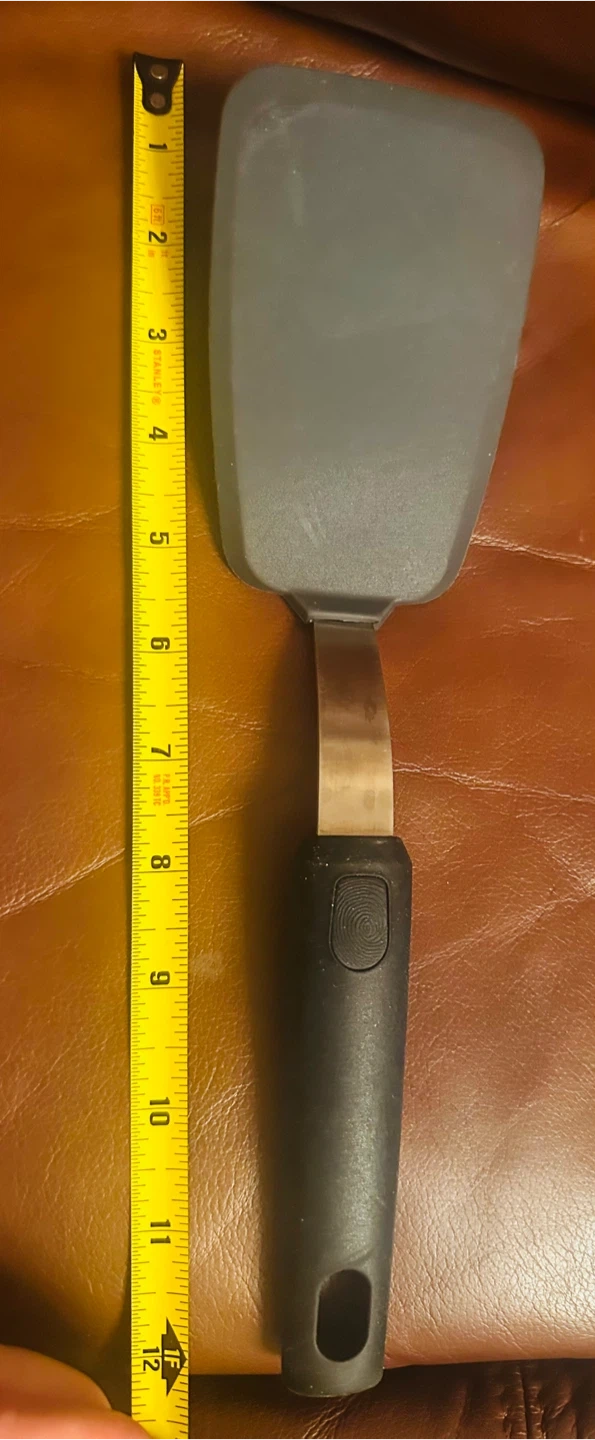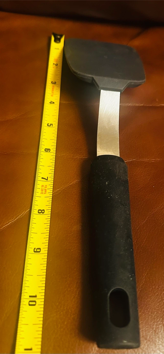 This is a kitchen spatula with a metal handle and a black silicone head. It's about 12 inches long. The spatula head is approximately 4 inches wide.
