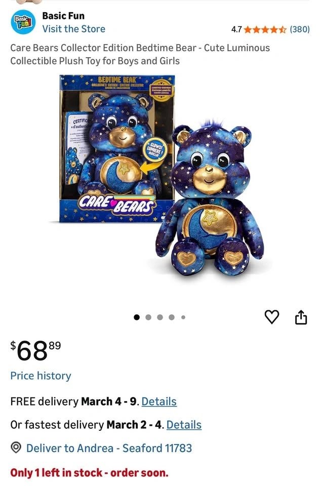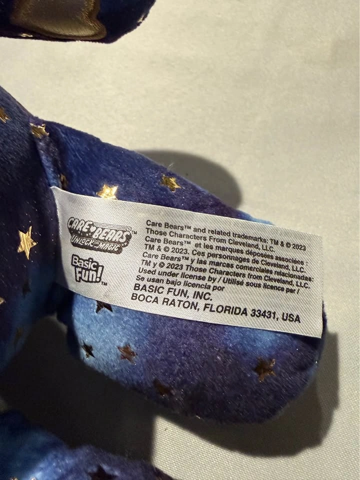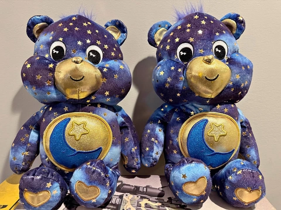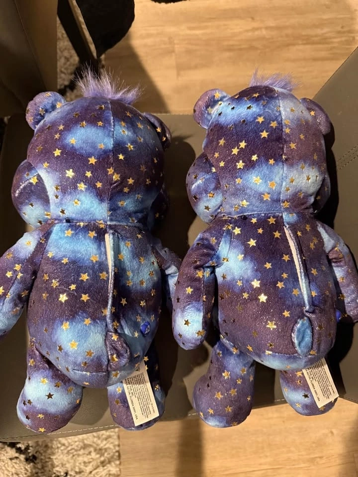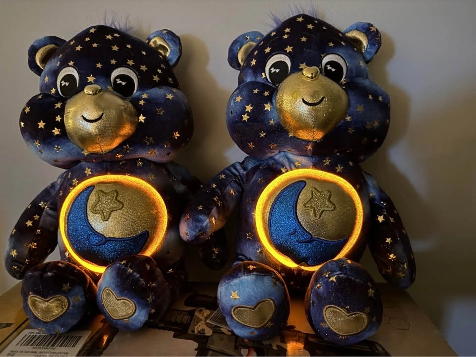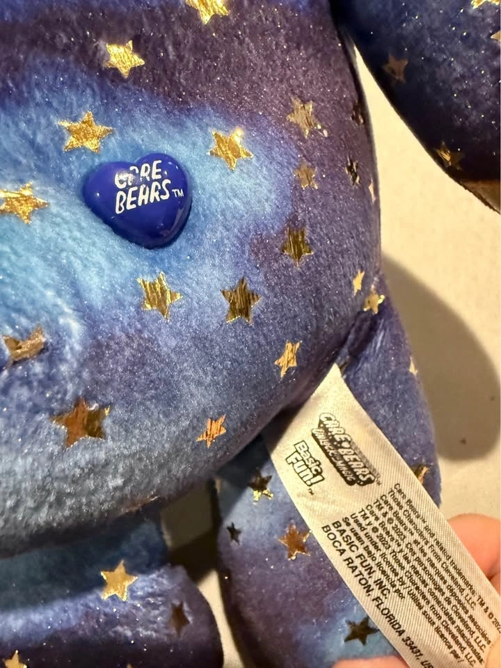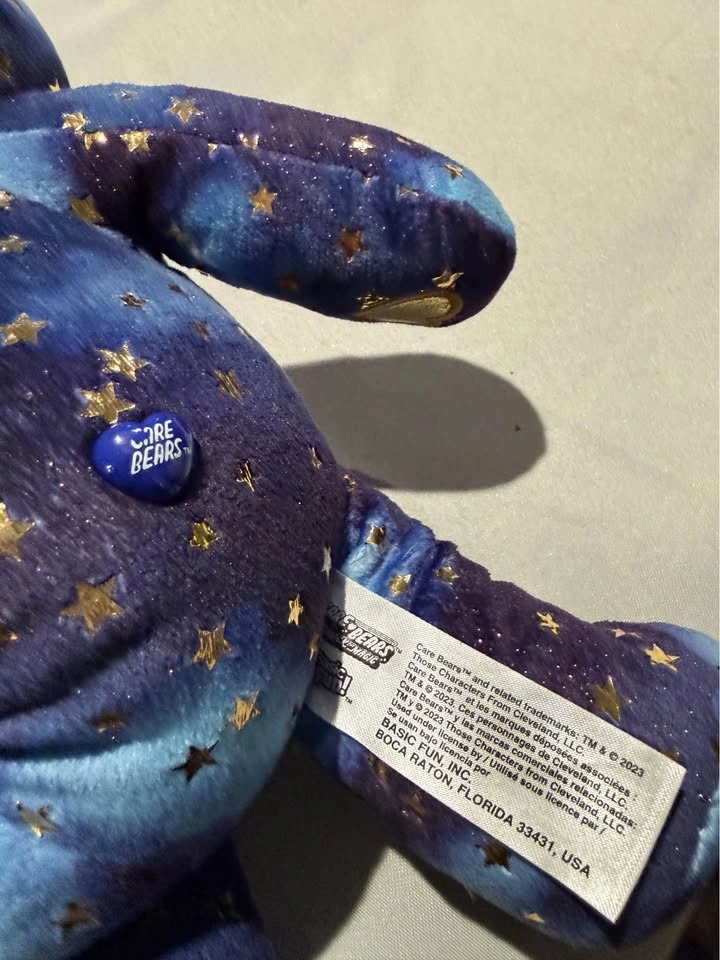 Bright Care Bears Dream Bright Bear pair. These plush bears have a cool galaxy design with gold stars and a moon belly badge. Each bear has a light-up feature on its tummy, making them super cozy. Also has little gold hearts on their feet. Made by Basic Fun! No box or card, these are just the plushies. $30 each or both for $50. These are sold as is. Both come with fresh batteries!