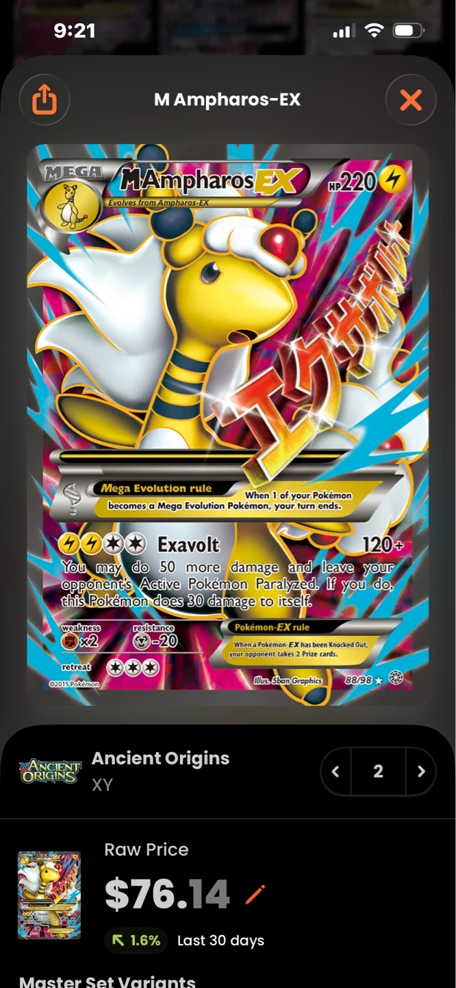 Mega Ampharos-EX from the Ancient Origins set. Features the 'Exavolt' attack. This is a Pokémon-EX card. It's card number 88/98.