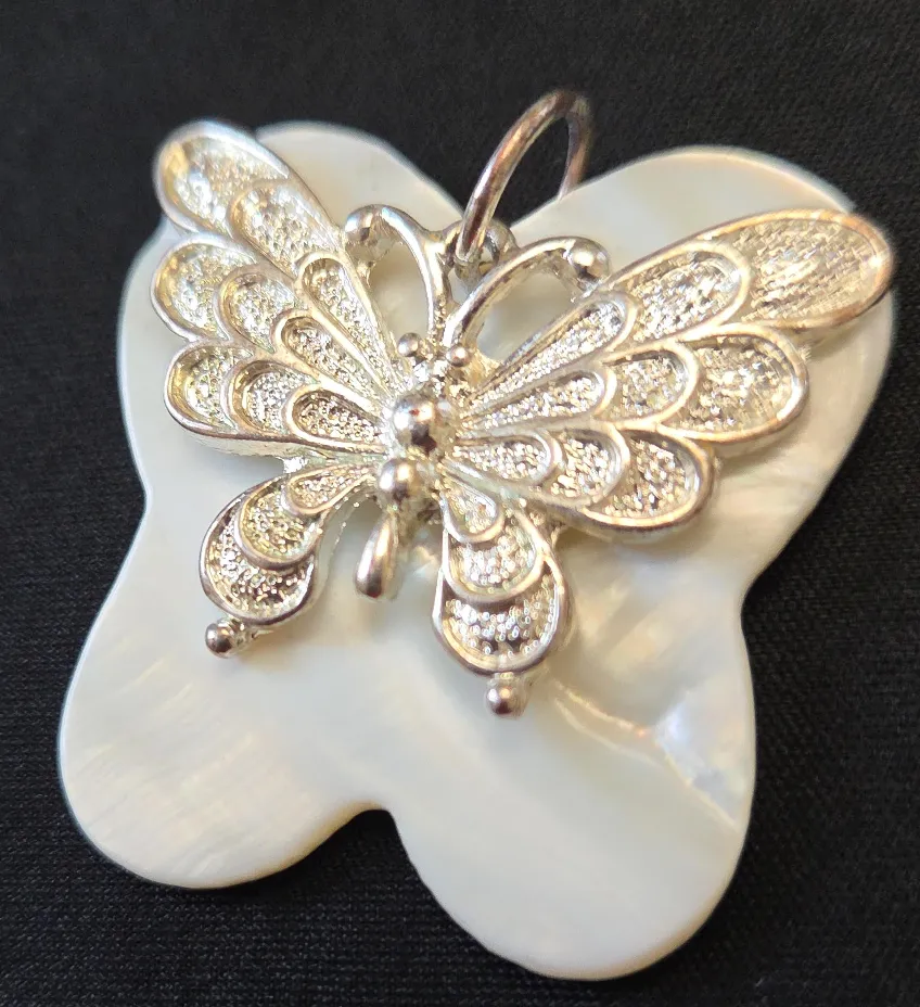 Selling a beautiful butterfly pendant. It features a delicate silver-tone butterfly on a pearlescent white background. Perfect for adding a touch of elegance to any outfit!