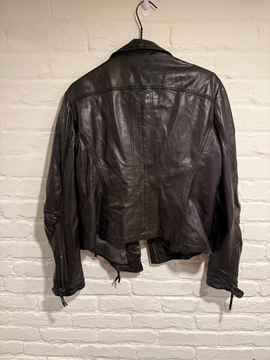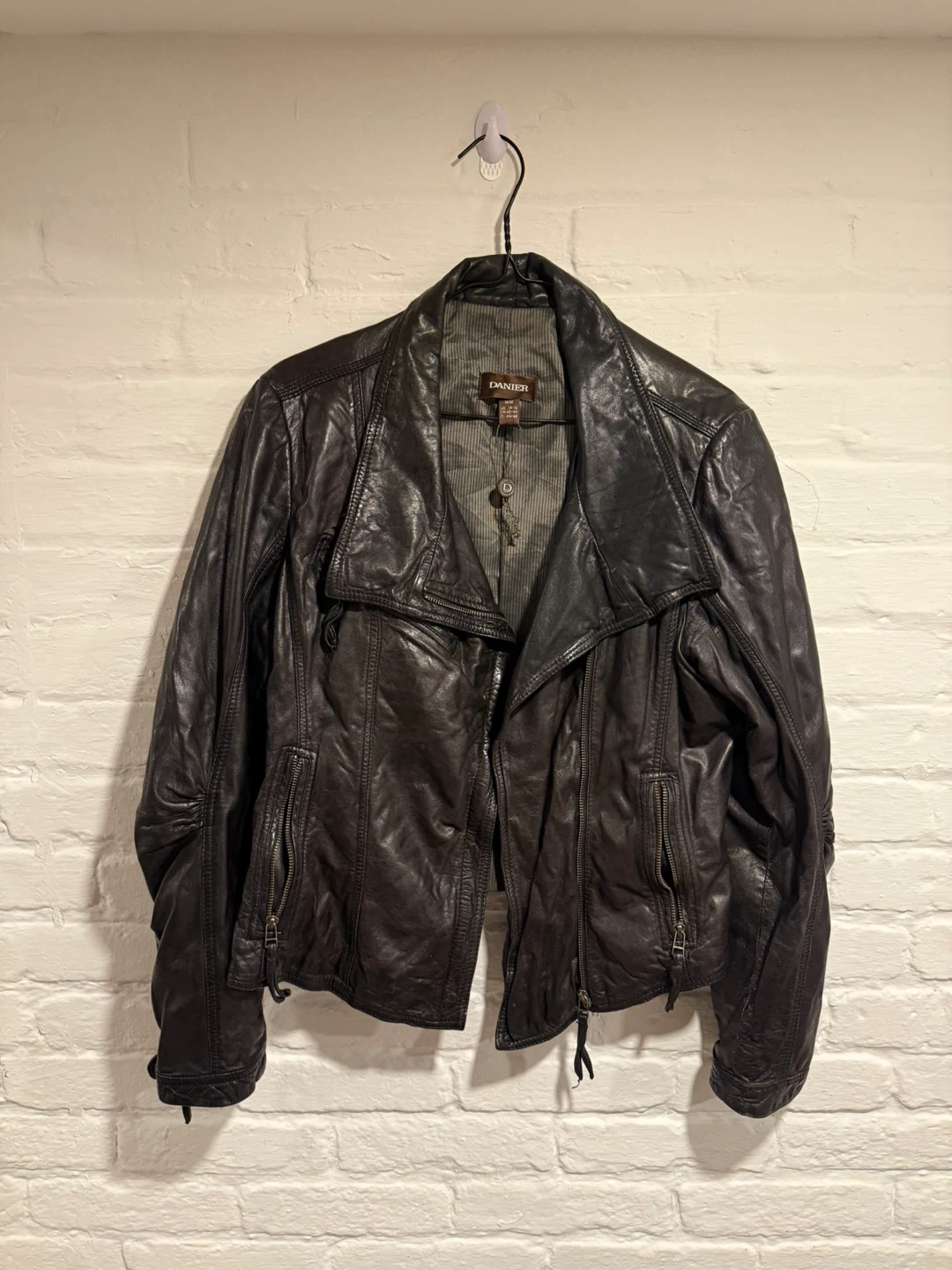 Selling a Danier leather jacket in size M/M. The tag also indicates UK size 14-16, FR size 42-44, and IT size 44-46. It is in good condition and ready for a new home