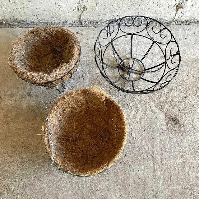 Bring charm to your garden, balcony, or patio with this set of 3 metal hanging planters. Two come with coco/burlap liners, and one is an open metal basket ready for a new liner.