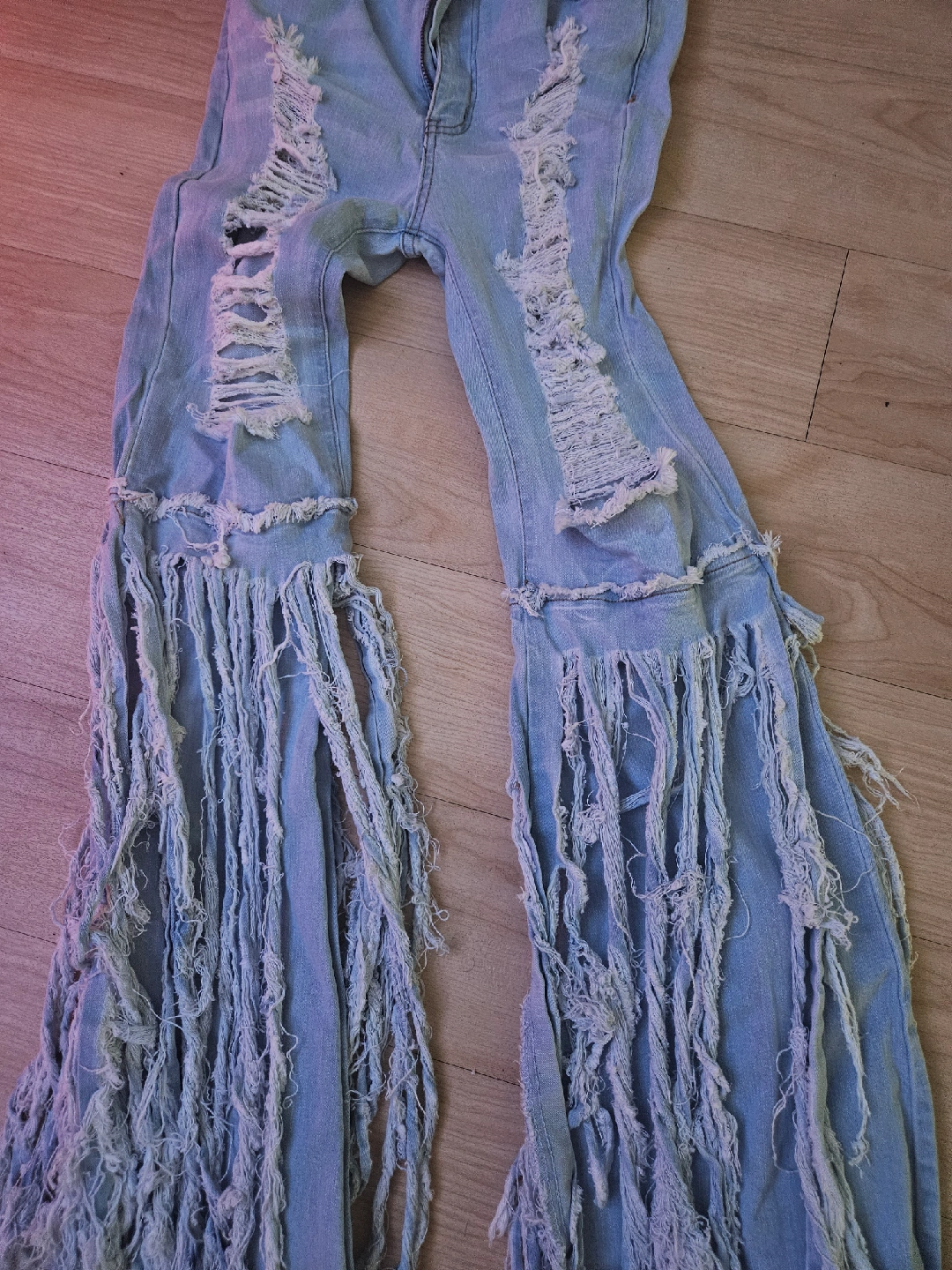 These light wash jeans feature a distressed design with fringe detailing at the bottom. They're in good condition and ready for a new home!