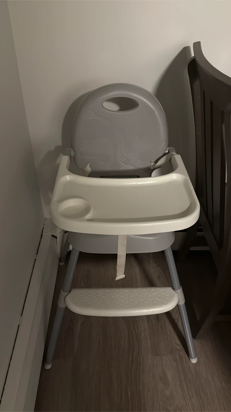 Selling a high chair in good condition. It's a grey and white colour, perfect for feeding time! It has a tray and a footrest for your little one's comfort. It's easy to clean and store, making meal times a breeze