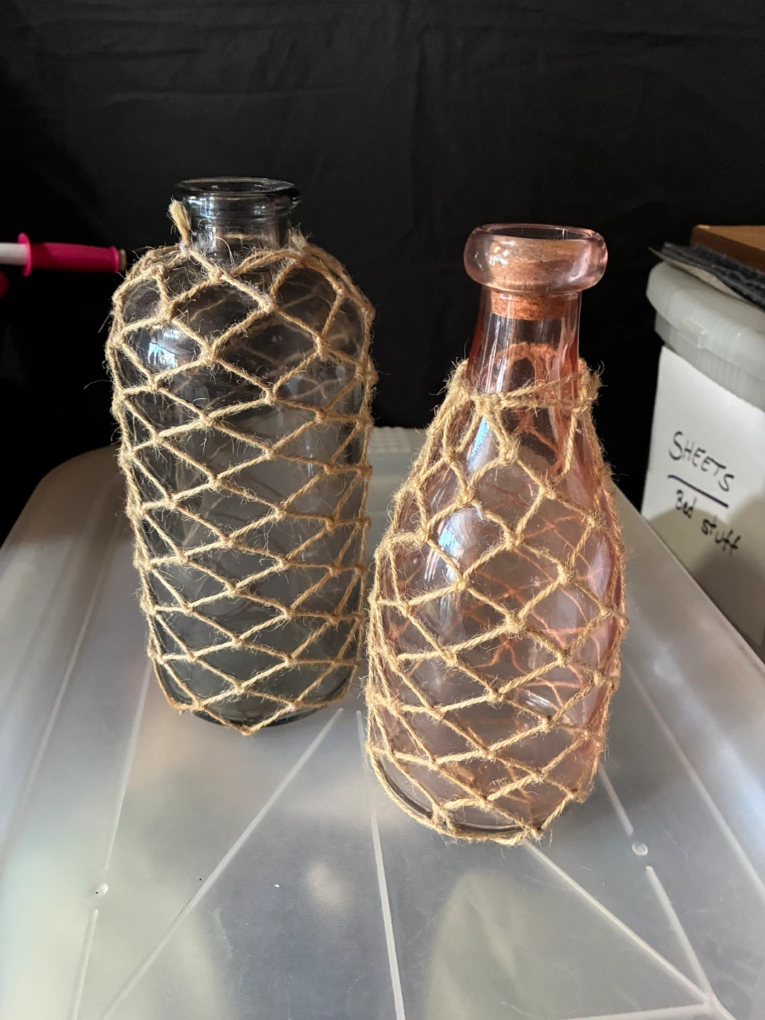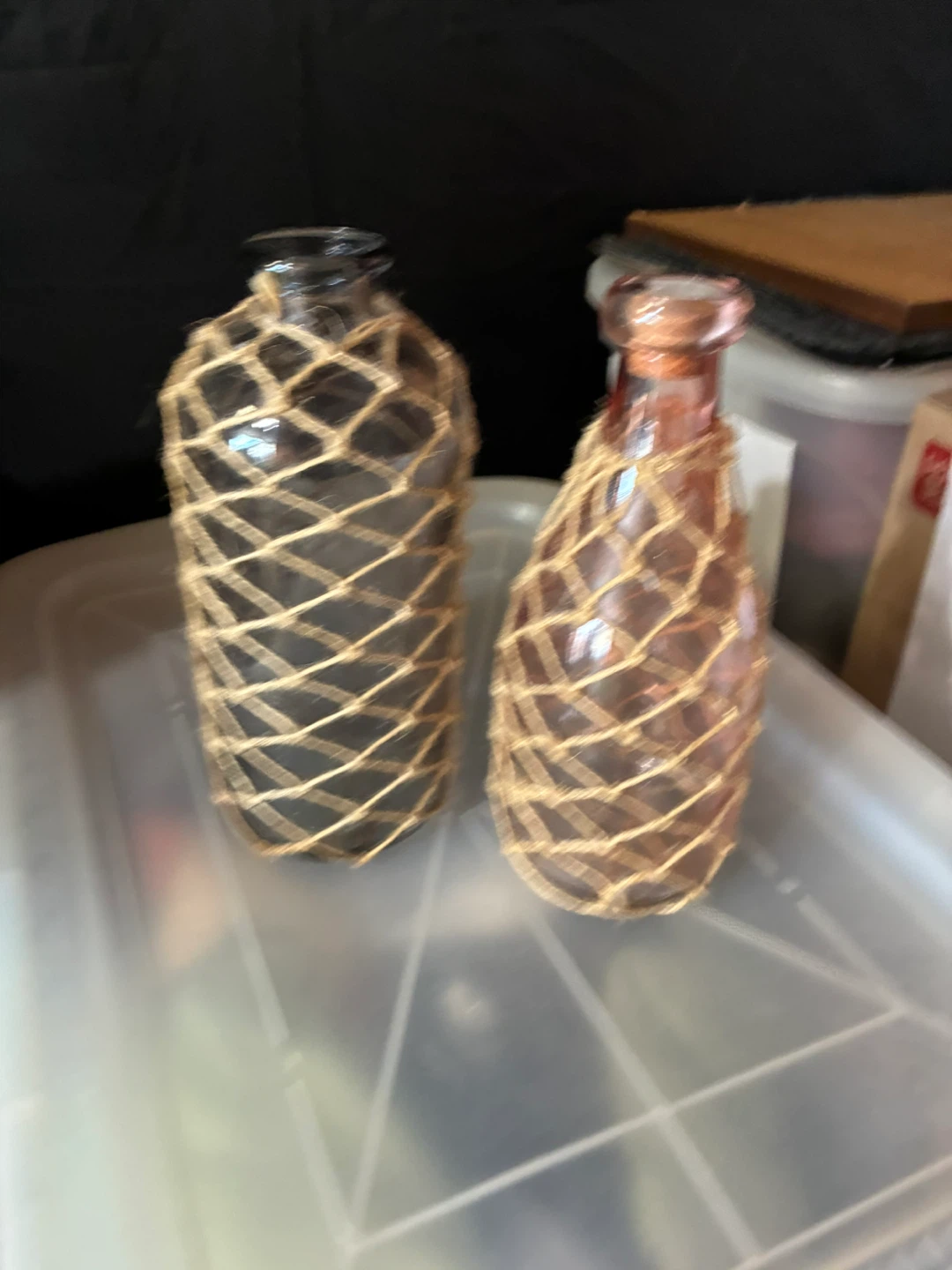 Two decorative glass bottles with jute netting. One is a clear/gray glass, and the other is a pink/peach color. They would look great as a decorative touch in any room!