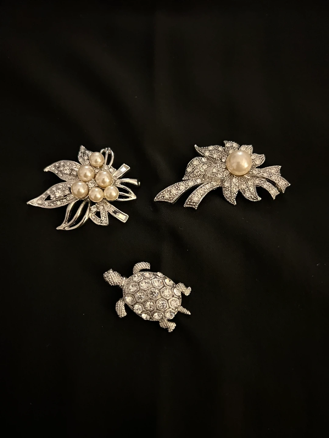 Selling 3 vintage style brooches! They feature intricate designs with rhinestones and faux pearls. There are 2 flower designs and a cute turtle brooch. Perfect for adding a touch of sparkle to any outfit!