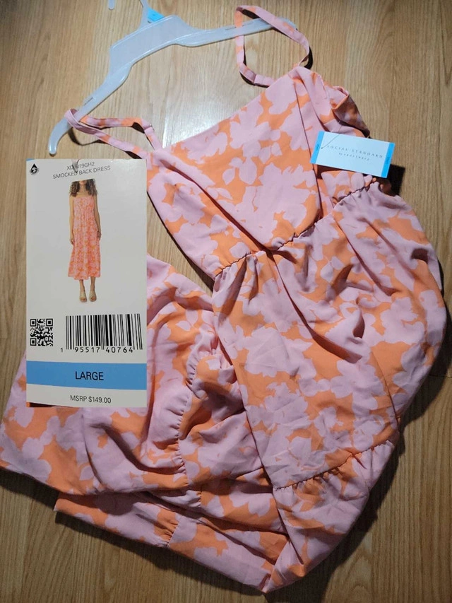 This A Common Standard Smocked Back Dress in size large features a charming pink and orange floral pattern, perfect for a sunny day! It's brand new with tags, ready to add a splash of colour to your wardrobe. The smocked back ensures a comfortable and flattering fit. Specifications: * Brand: A Common Standard * Size: Large * Colour: Pink and Orange Floral * Style: Smocked Back Dress * Condition: New with tags