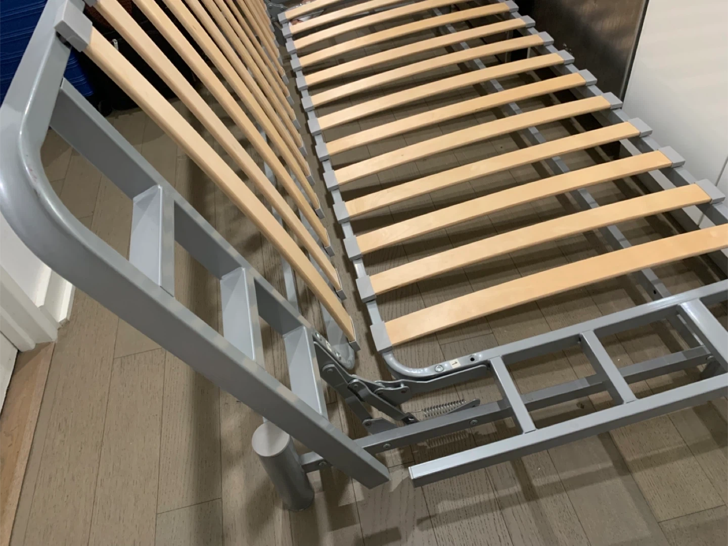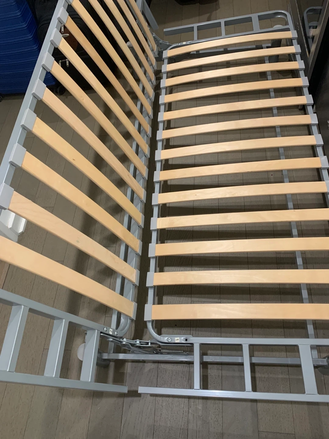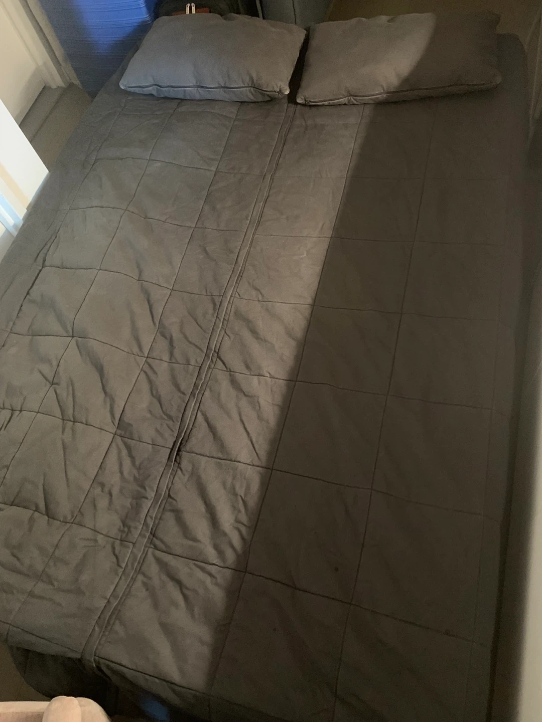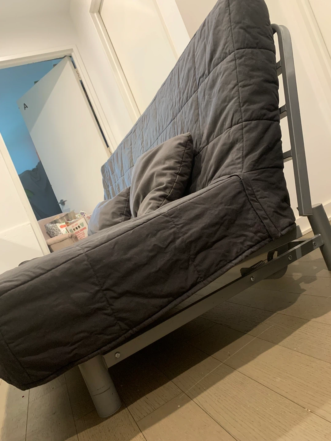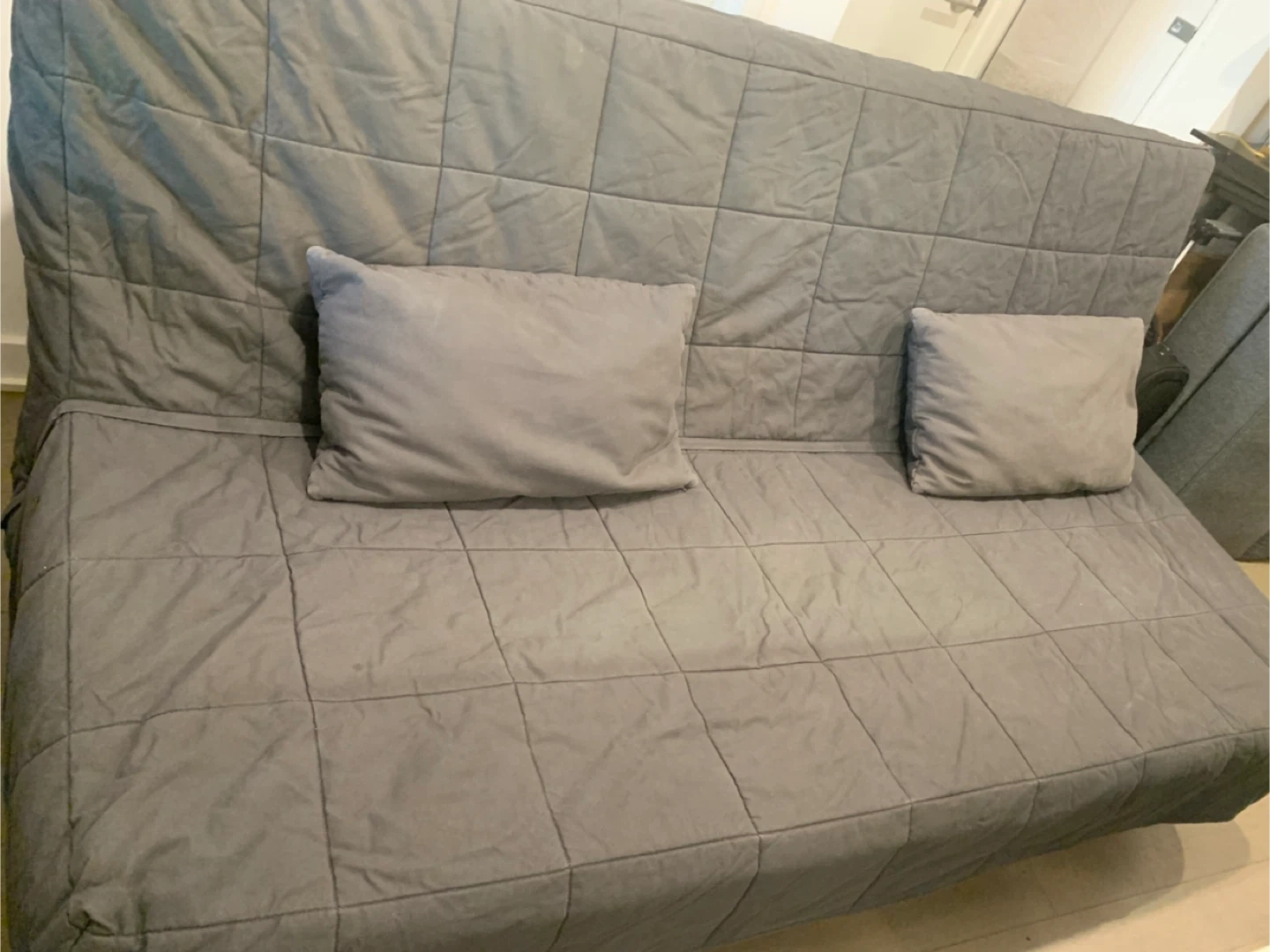 Selling a gray futon sofa bed. It's in good condition and comes with two matching pillows.
