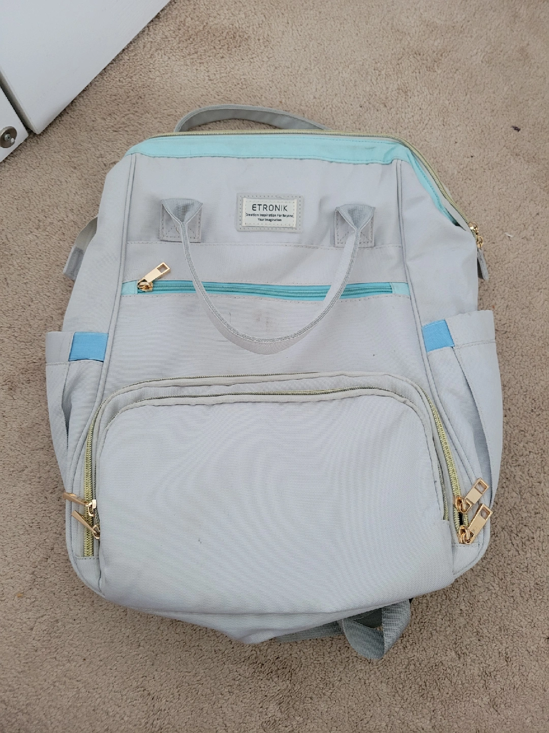 Looking to pass along this Etronik diaper bag backpack. It's in great shape and ready for a new home. The bag is a nice grey colour with light blue accents. Perfect for keeping all baby's essentials organized!