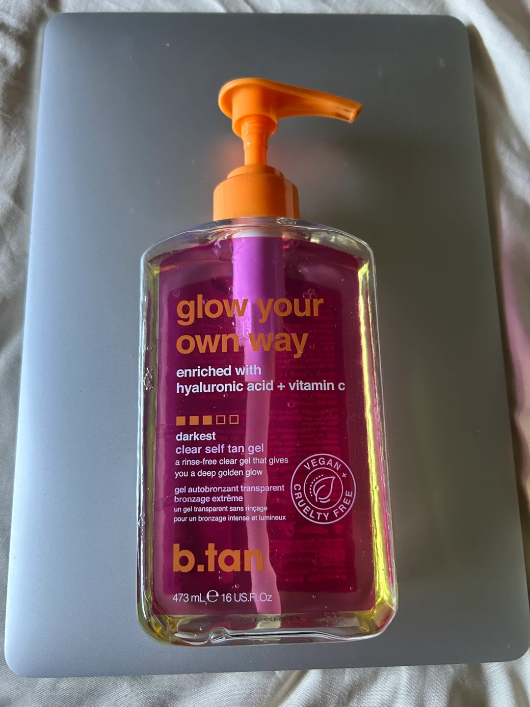 Get your glow on with b.tan's Glow Your Own Way self-tan gel! It's enriched with hyaluronic acid and vitamin C for a radiant, transfer-resistant tan. This clear gel gives you a deep golden glow, perfect for achieving that sun-kissed look without the sun. Vegan friendly and cruelty-free! The bottle is 3 quarters full .