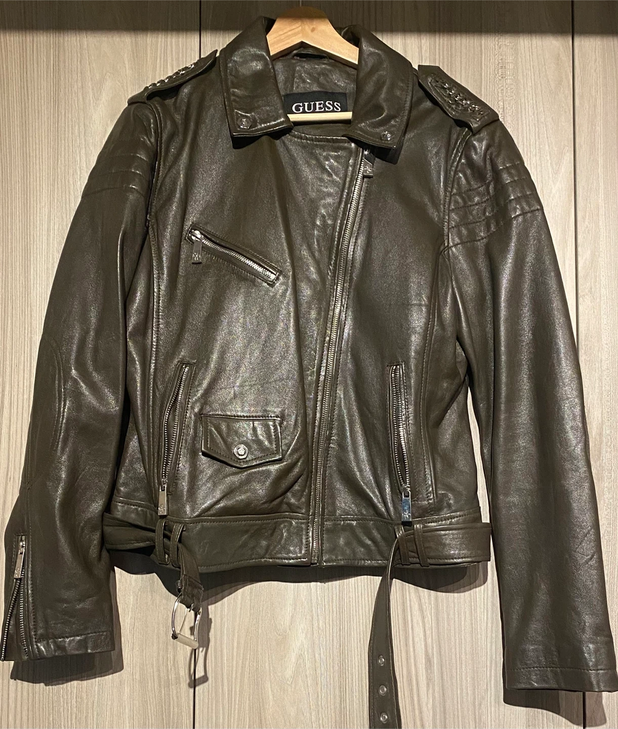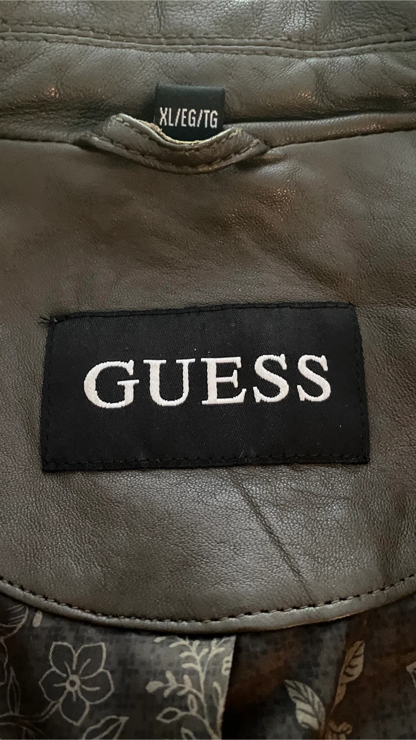 Selling a Guess leather jacket in olive green. It's a size XL and has a stylish design with zipper details on the sleeves. Perfect for adding a cool edge to your outfit!