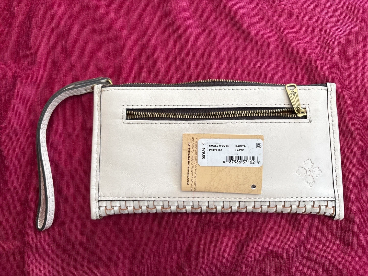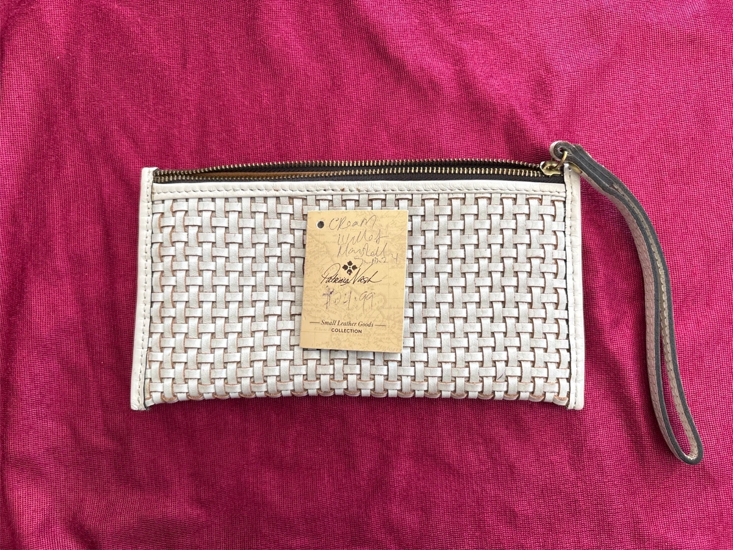 63This is a Patricia Nash Carita small woven wristlet in a lovely latte color. It's part of the Small Leather Goods Collection. Originally priced at $79.00, this wristlet is perfect for carrying your essentials in style