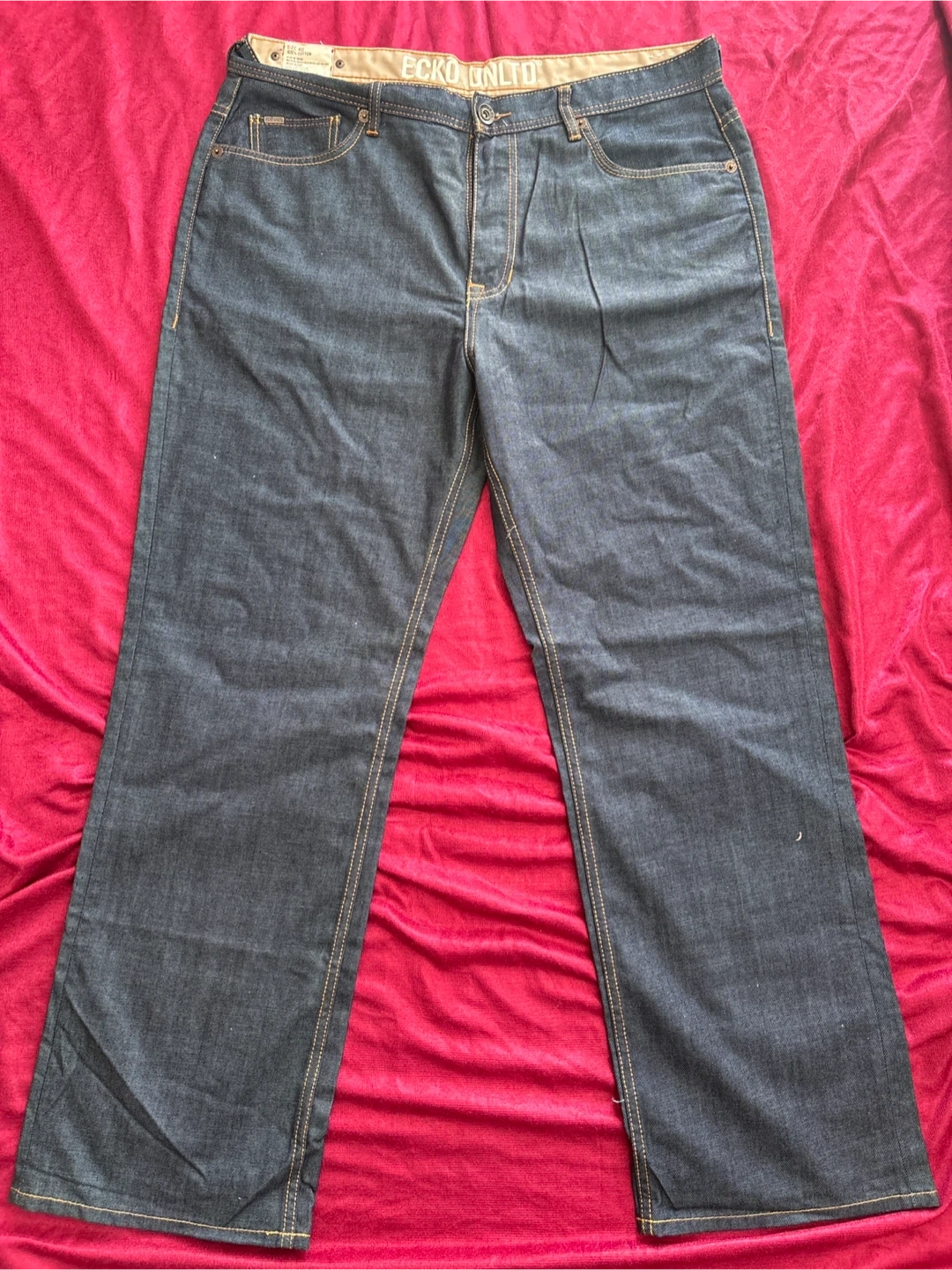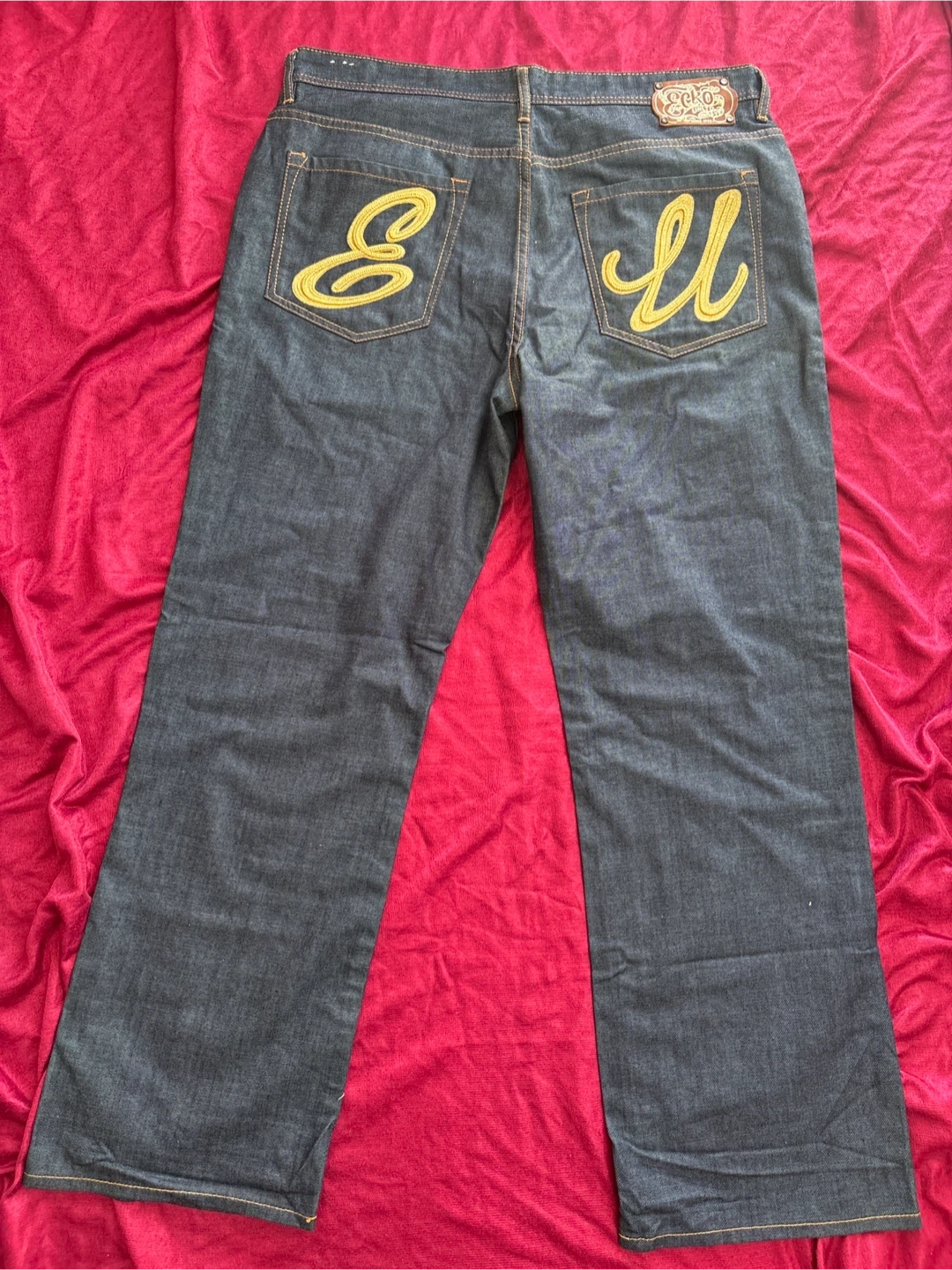 63Ecko Unlimited jeans Relaxed fit with a unique design on the back pockets. These jeans are in good condition and ready for a new home! They feature a classic denim look with stylish detailing