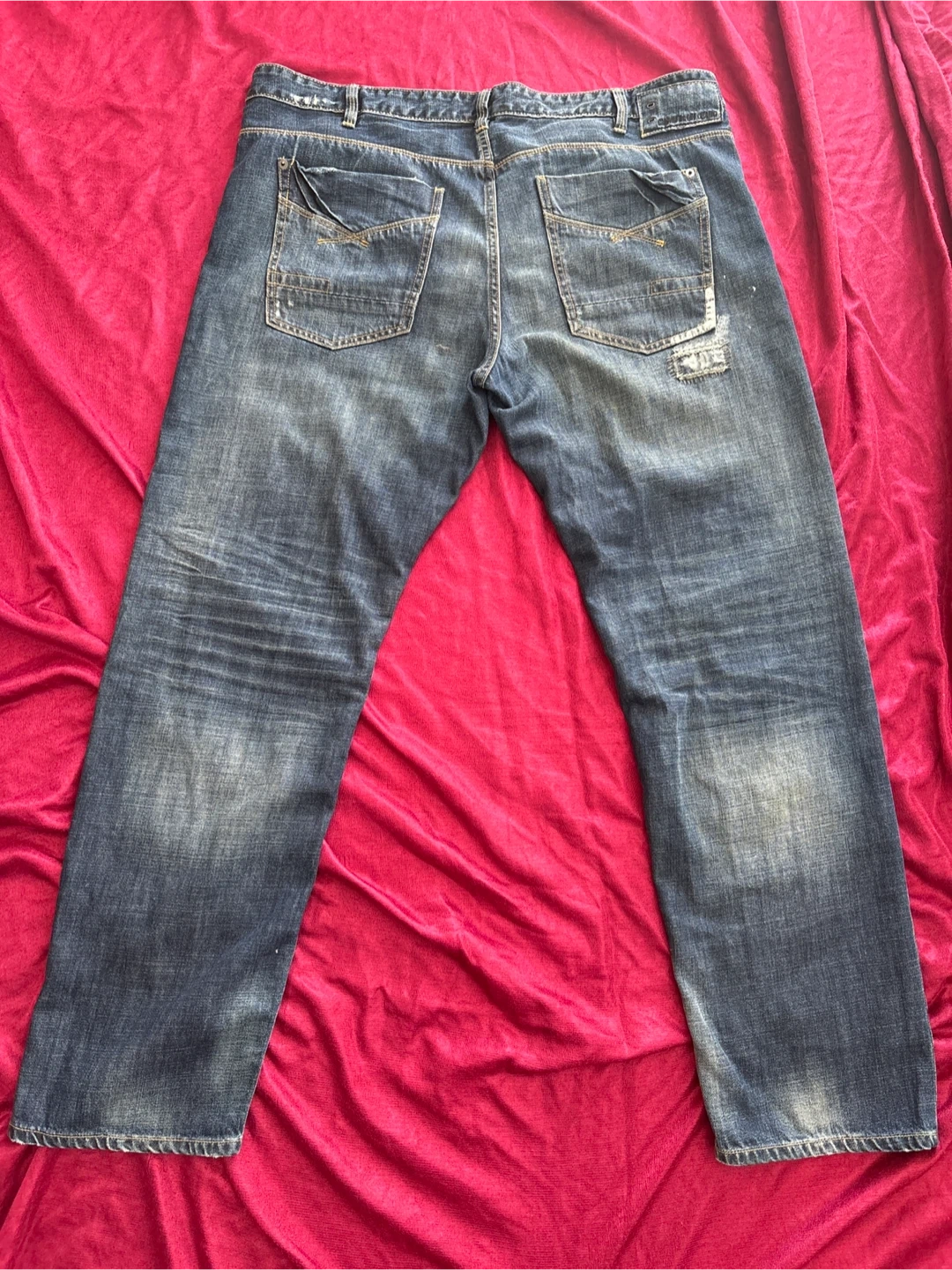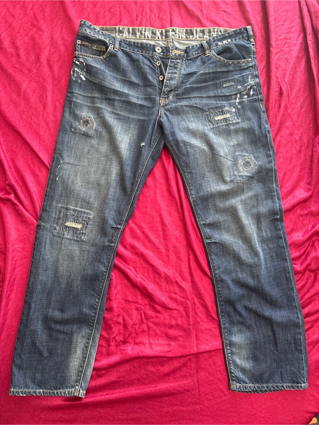 63Selling a pair of Calvin Klein Rocker jeans in Designed distressed look with some patches and fading. Note : These are buttoned up jeans (Not traditional zipper)