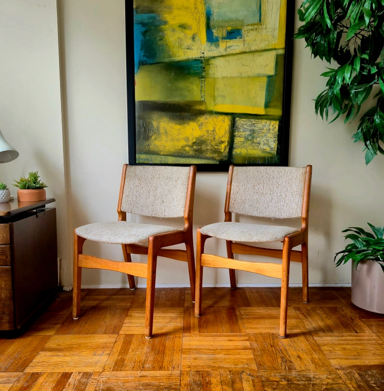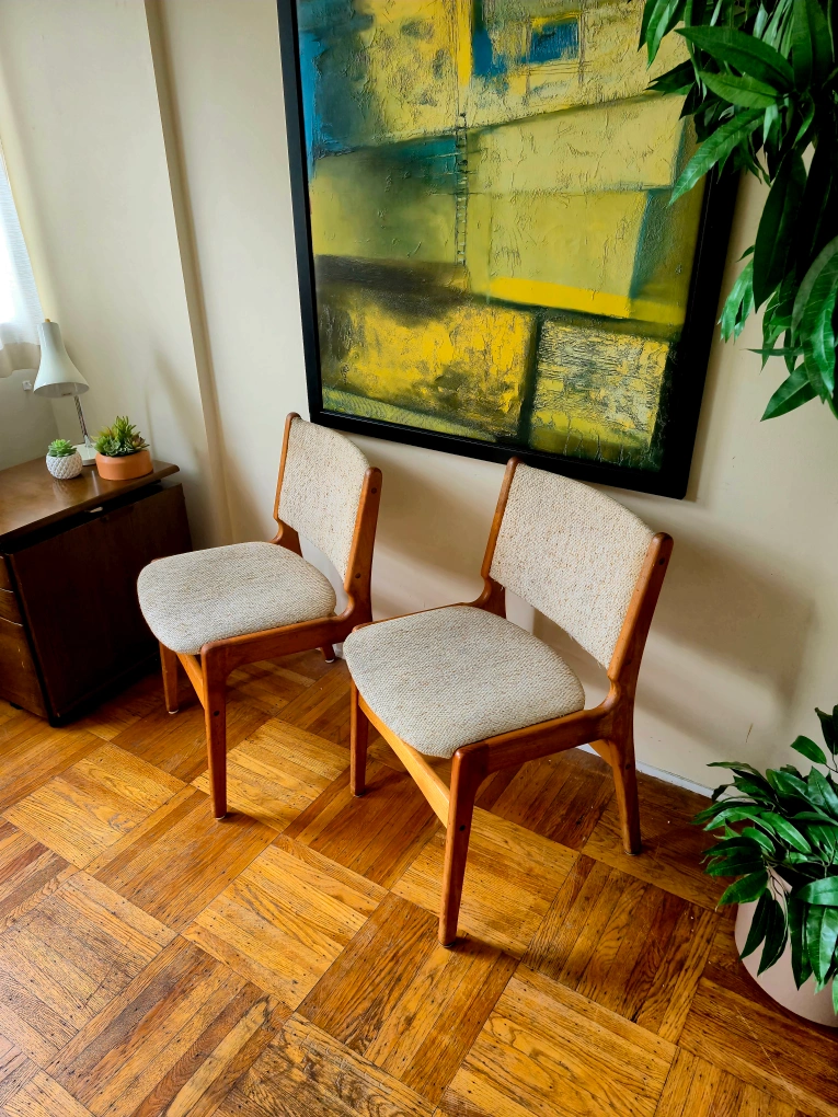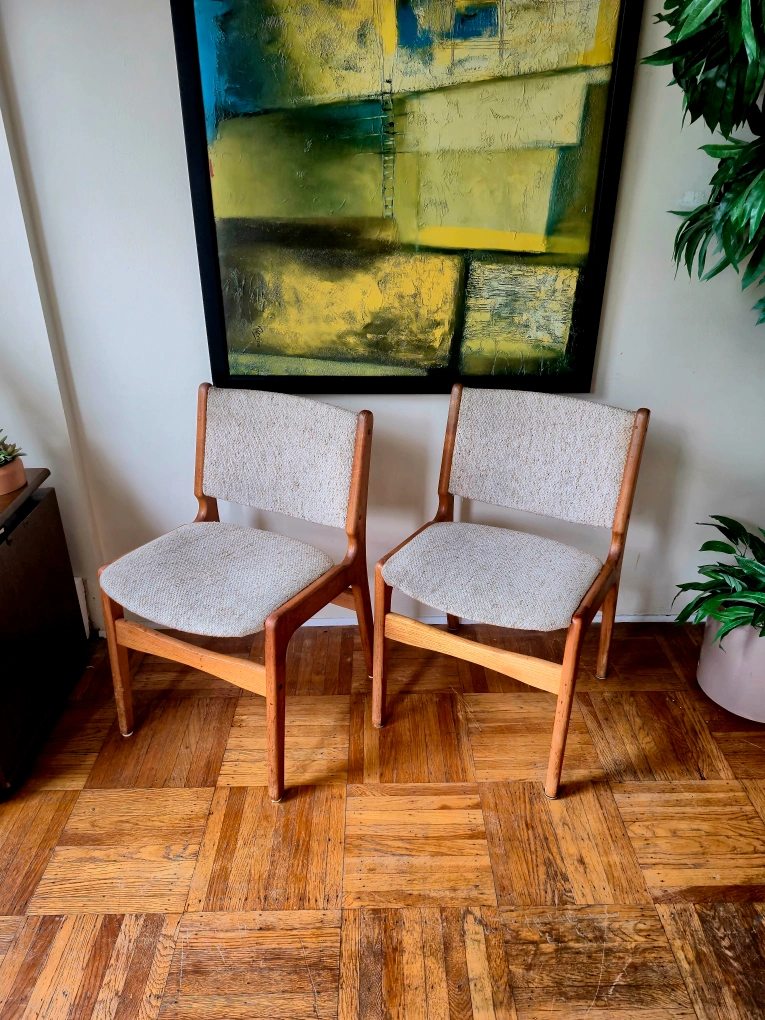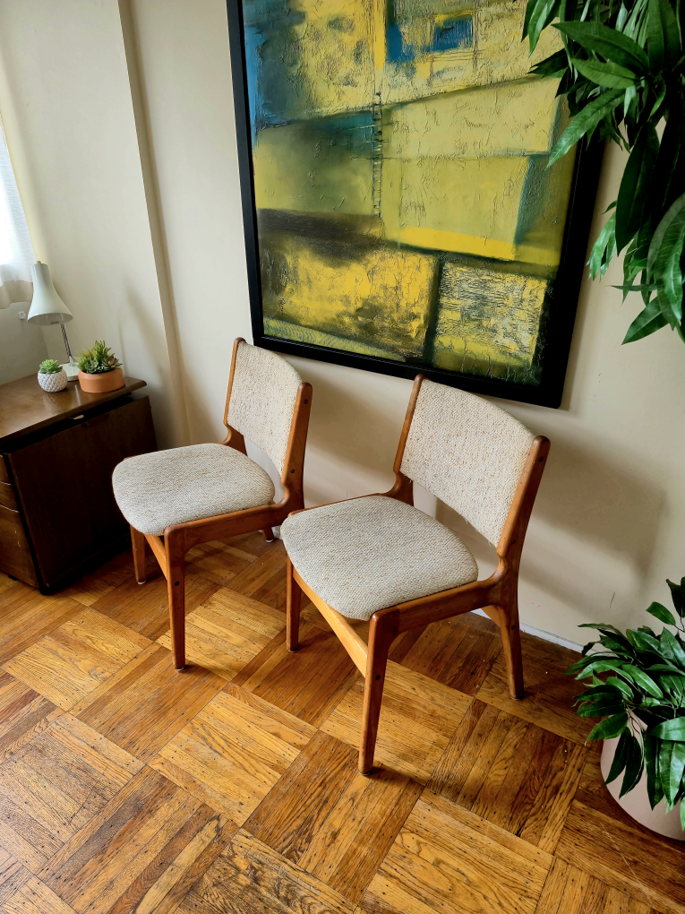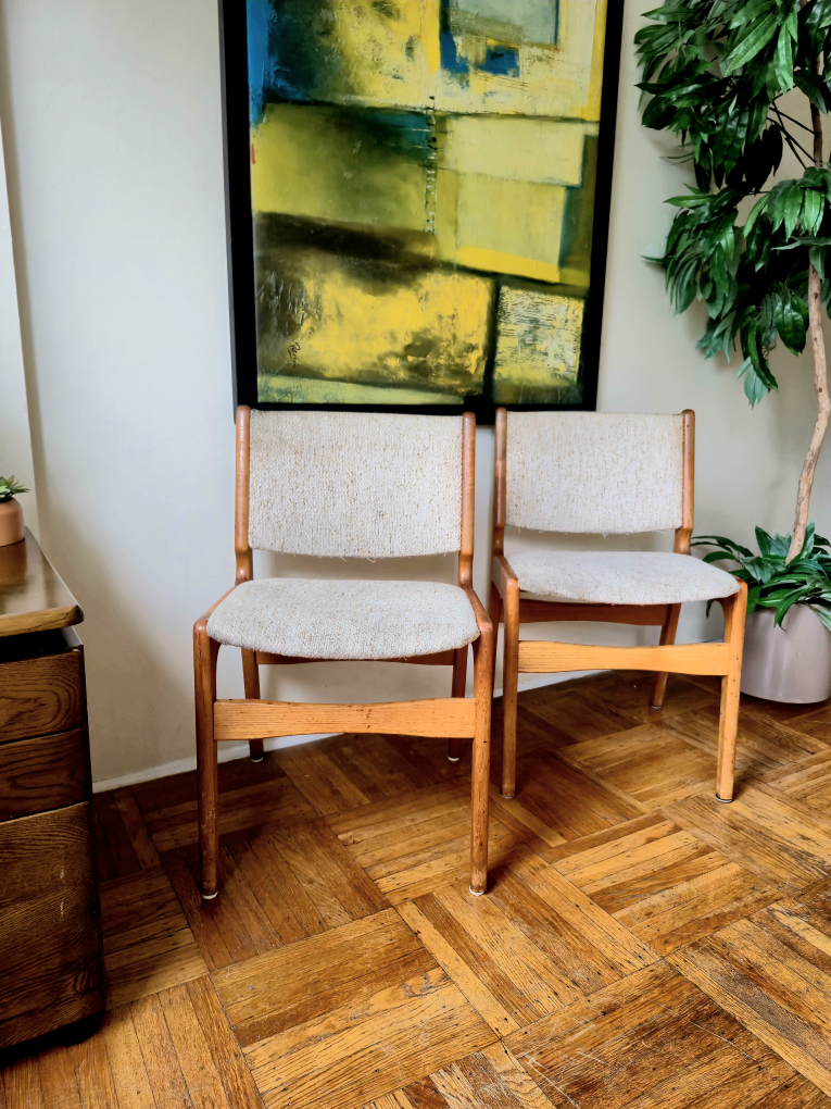 Featuring solid wood frames and textured neutral upholstery, these chairs are both sturdy and comfortable. Their clean lines and warm tones make them perfect for dining rooms, offices, or accent seating. four available at $135 each