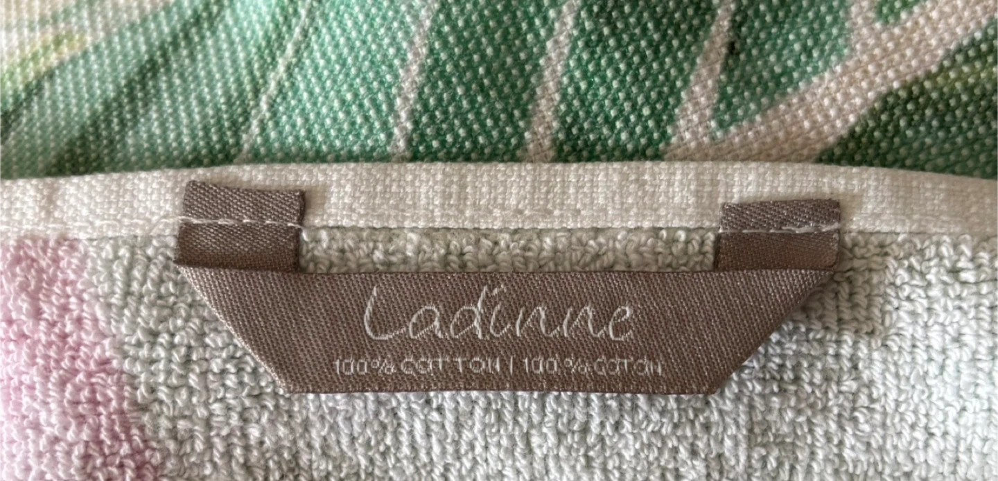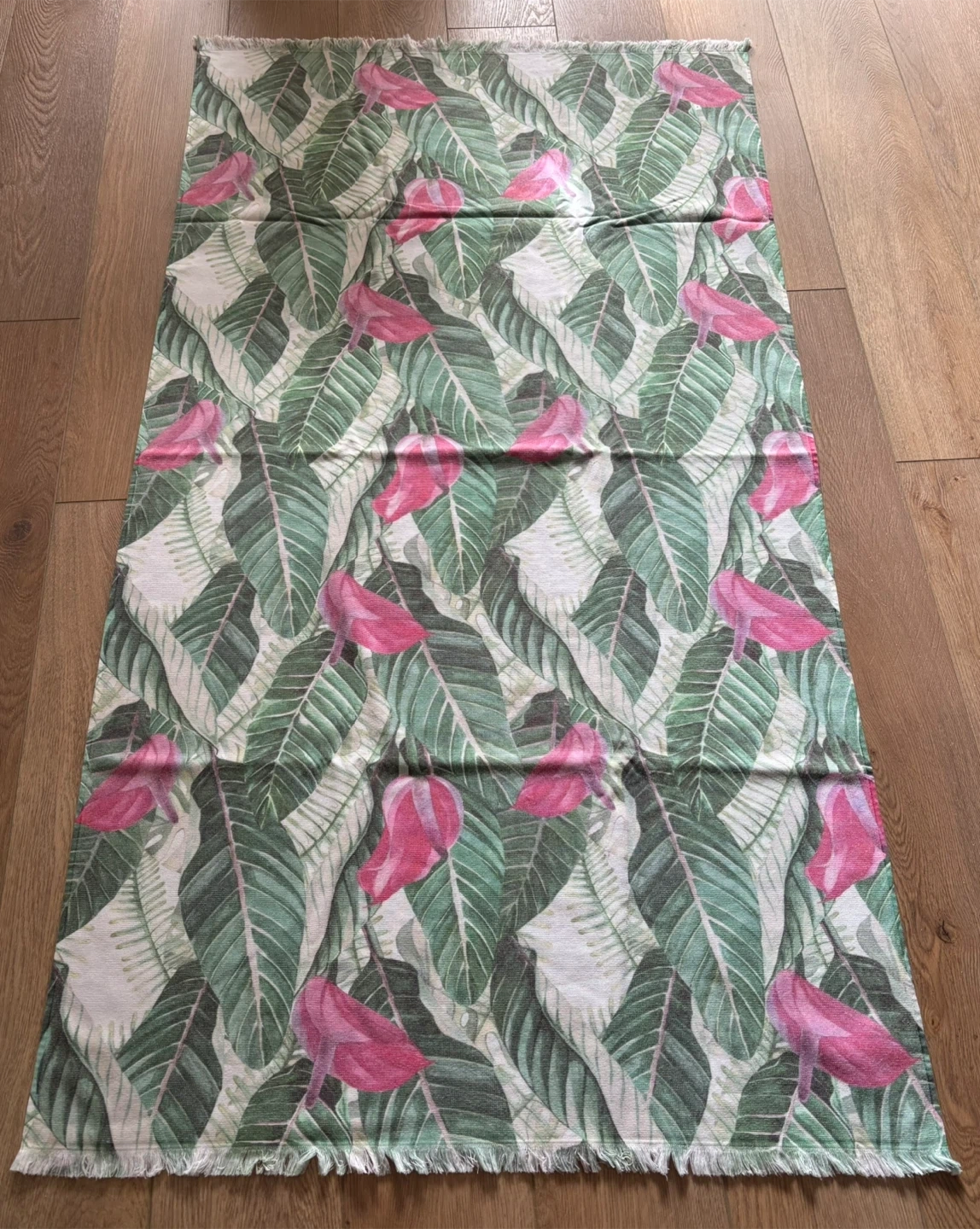 Selling a Ladinne beach towel made of 100% cotton. It has a lovely tropical leaf and pink flower pattern. Great for the beach or pool!