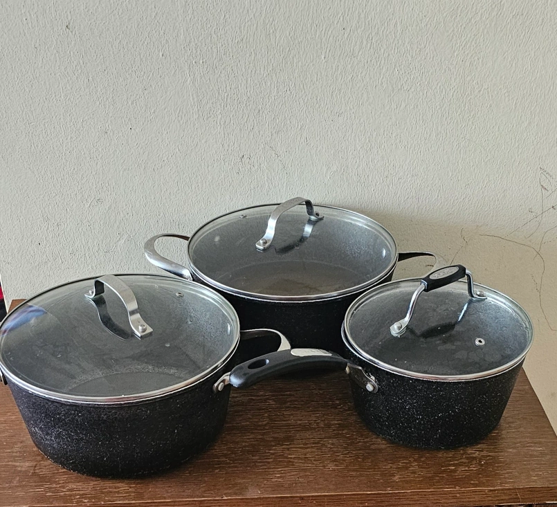 Selling a set of Lagostina cookware. The set includes three pots of varying sizes, each with a glass lid. They have a black speckled exterior and silver-tone handles. Great for any kitchen!