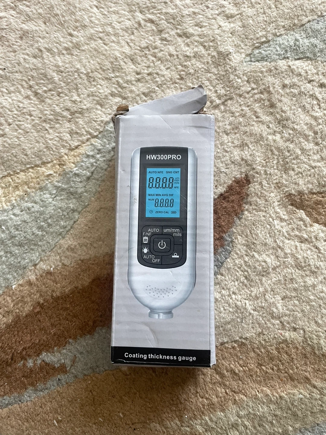 Digital paint thickness gauge for measuring coating thickness on automobiles. Ideal for checking paintwork, body panels, and detecting repairs or repainted areas.