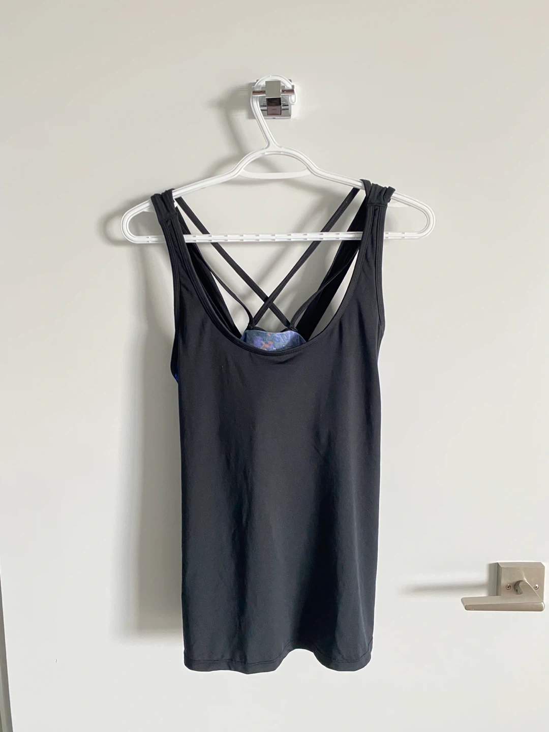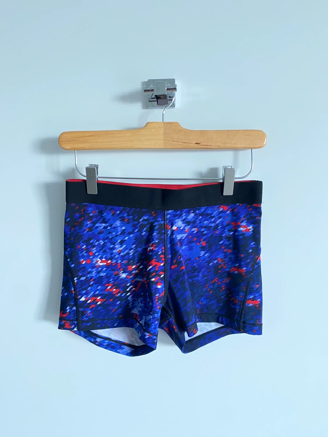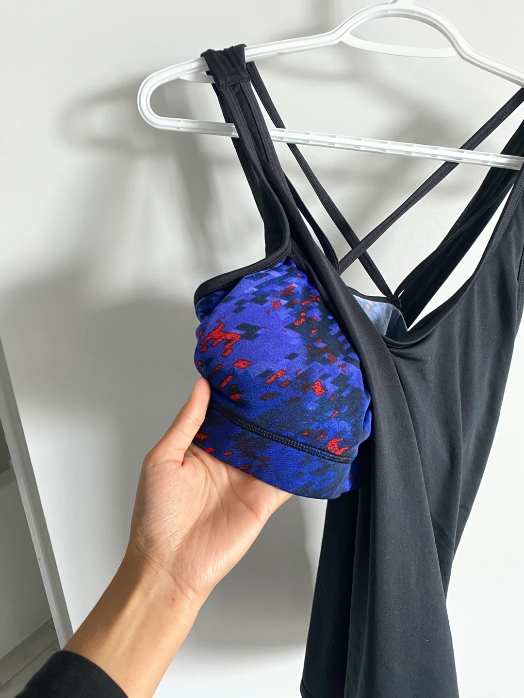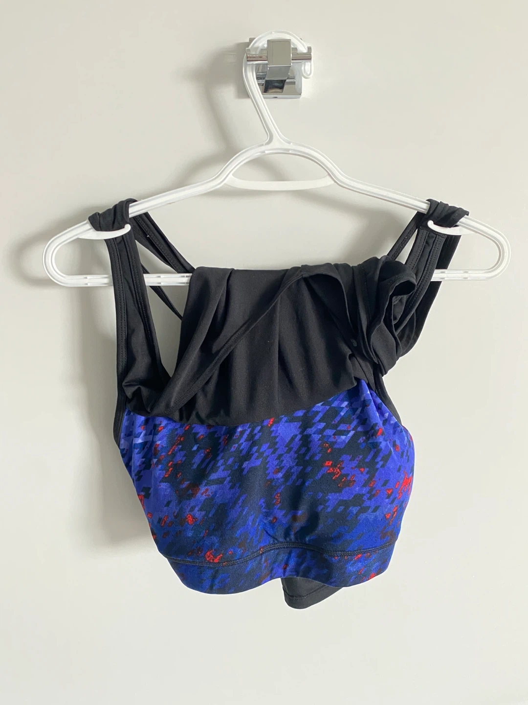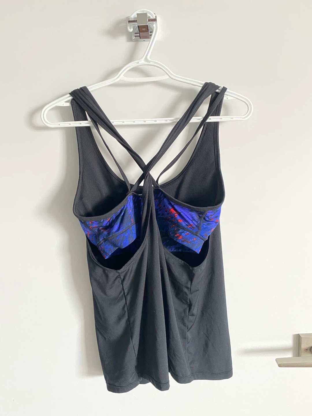 This super cute stylish matching workout set in size M has a tank top with an inbuilt padded sports bra (cups are also removable) and blue print shorts.