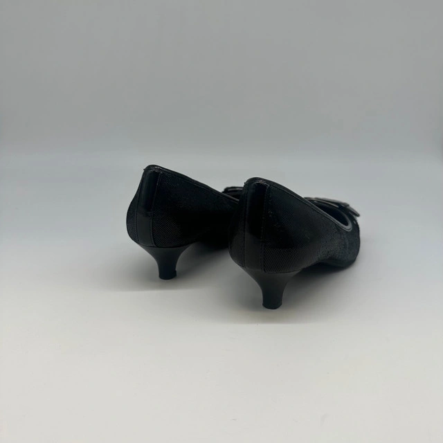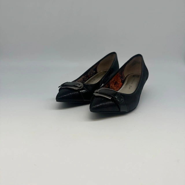 Step into style with these brand new Anne Klein iFlex black pointed toe kitten heels! These elegant heels feature a sleek black design with a pointed toe, perfect for adding a touch of sophistication to any outfit. They come in the original box and have never been worn. Size: 7