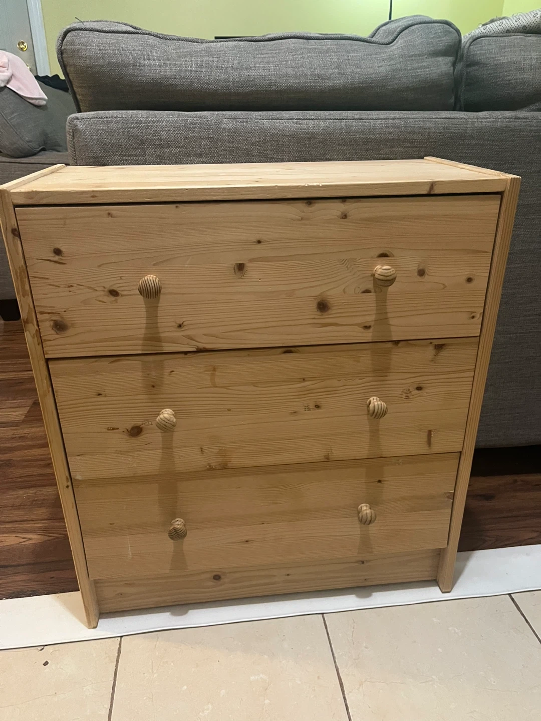 Here's a simple wooden dresser with three drawers. It's perfect for adding some storage to a bedroom or any other room in the house. The wood has a nice, natural finish. In very good condition. (Delivery available)
