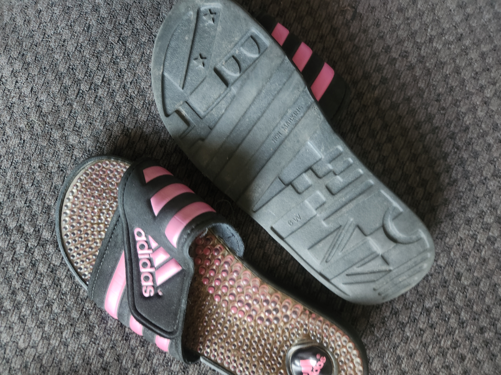 Selling a pair of Adidas Adissage slides in kids 7 They feature a black and pink colour scheme with the classic Adidas stripes. These slides are designed with a massaging footbed for extra comfort. They are in used condition, but still have lots of life left!