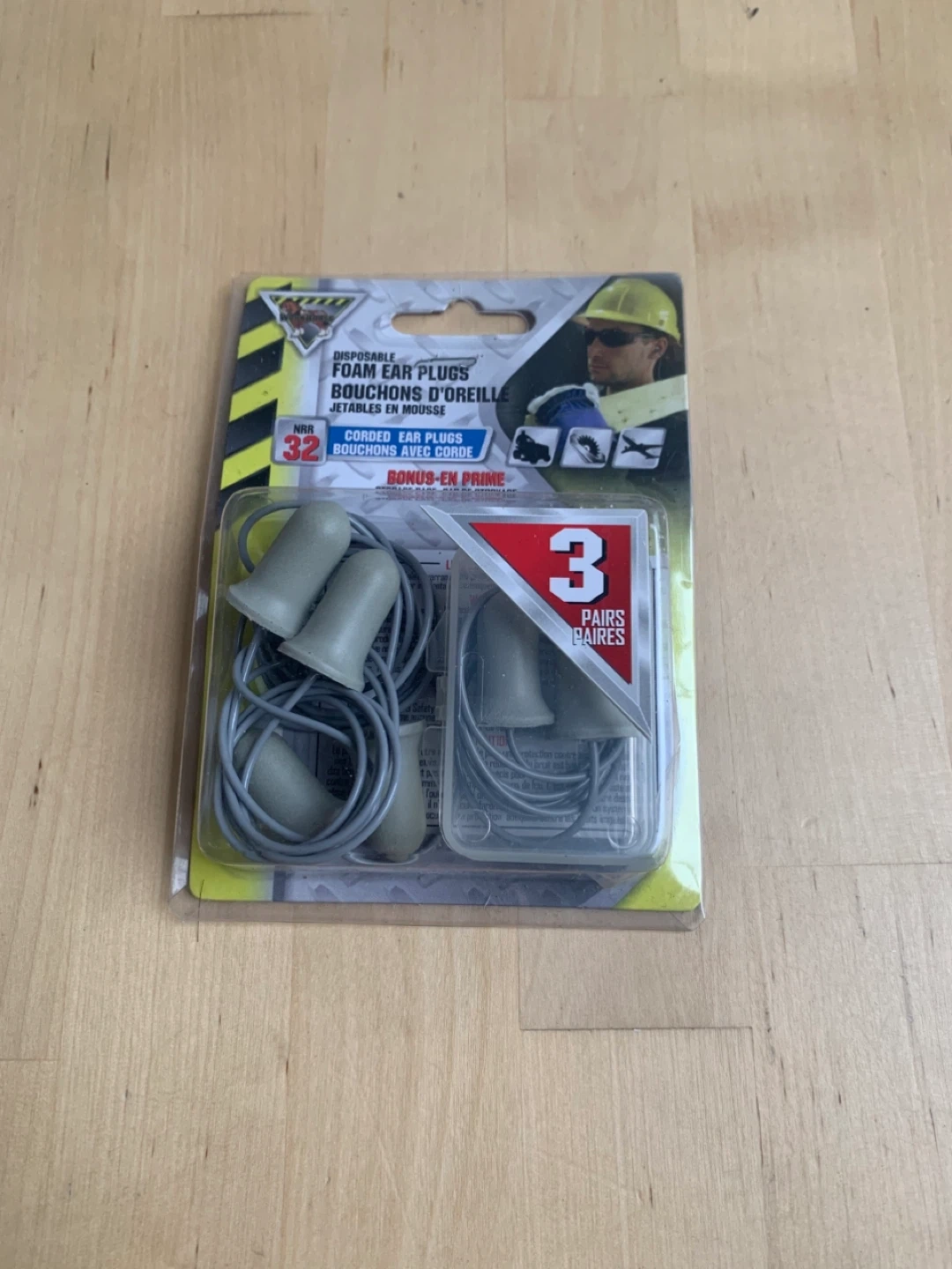Selling a pack of disposable foam ear plugs. The package includes 3 pairs of corded ear plugs. Great for reducing noise!