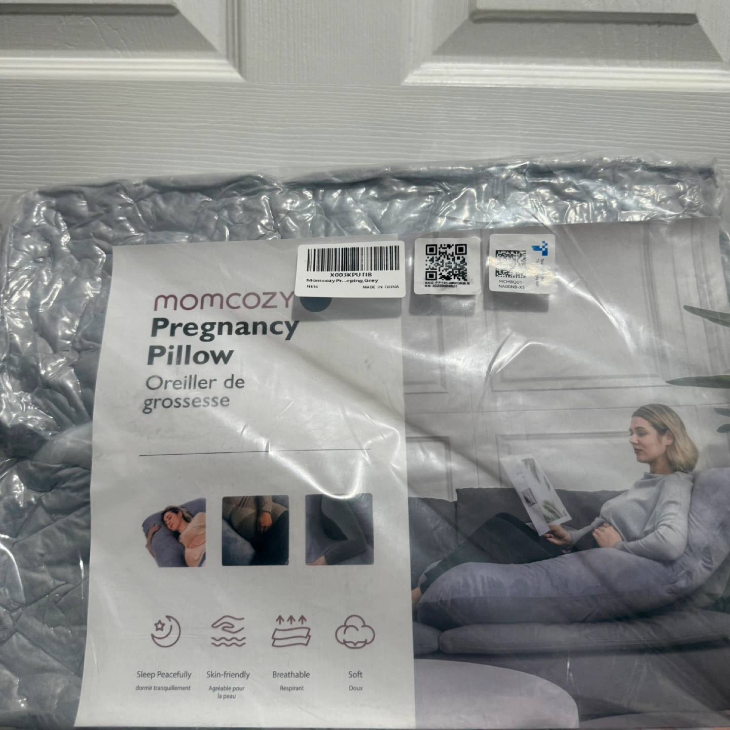 Momcozy Pregnancy Pillow in gray. It's skin-friendly, breathable, and soft. Helps you sleep peacefully!