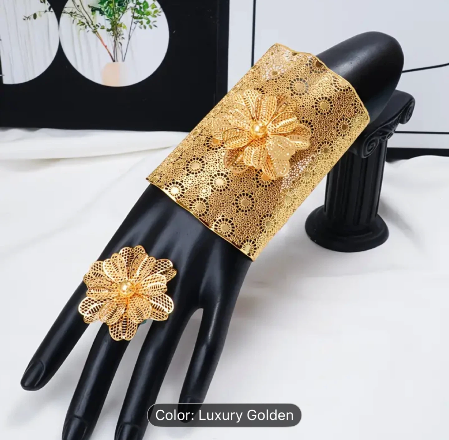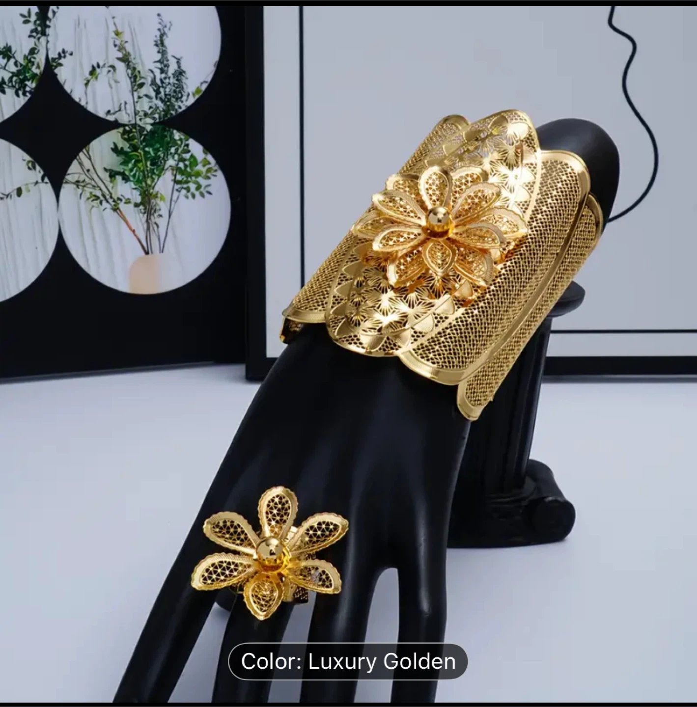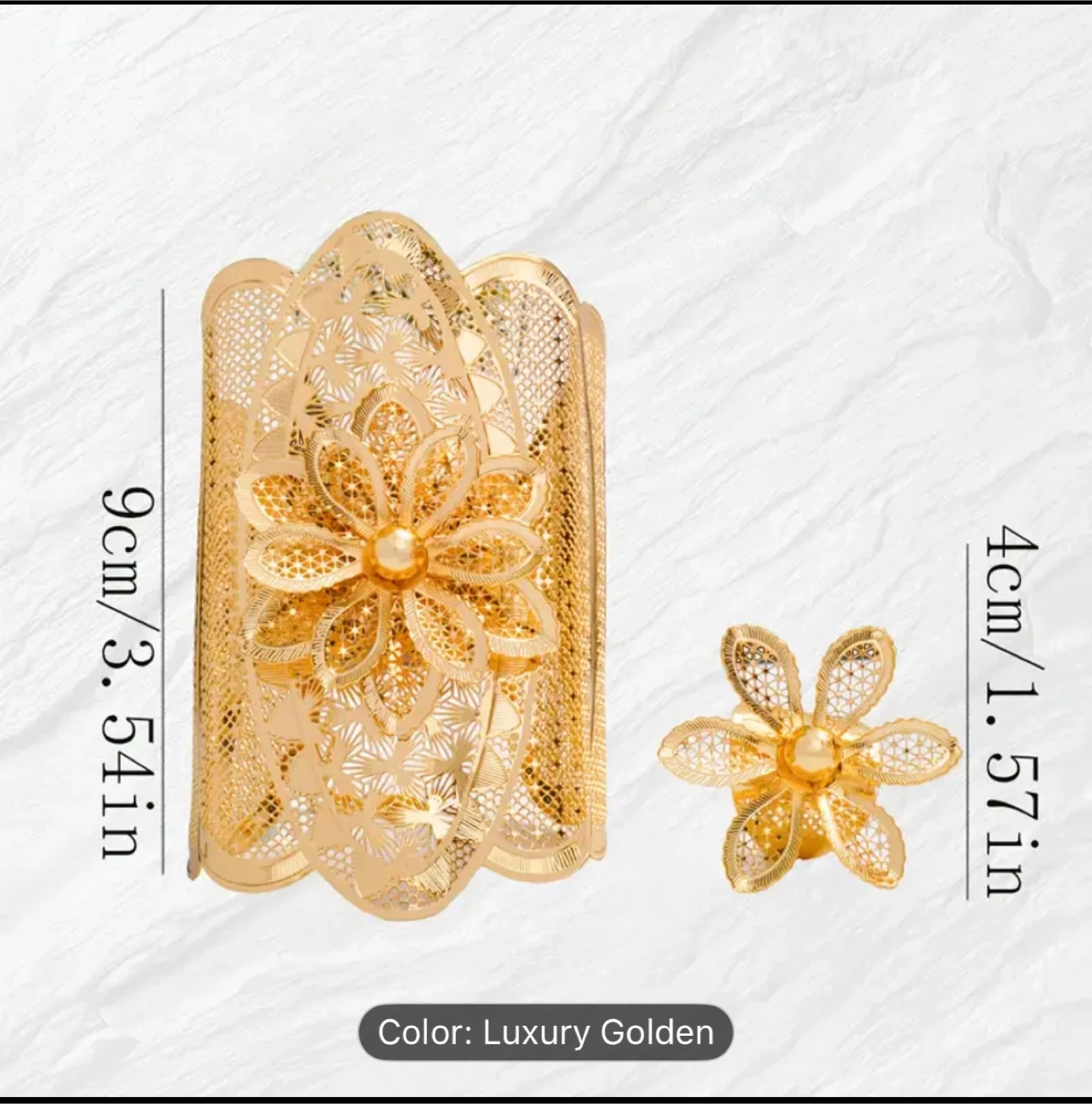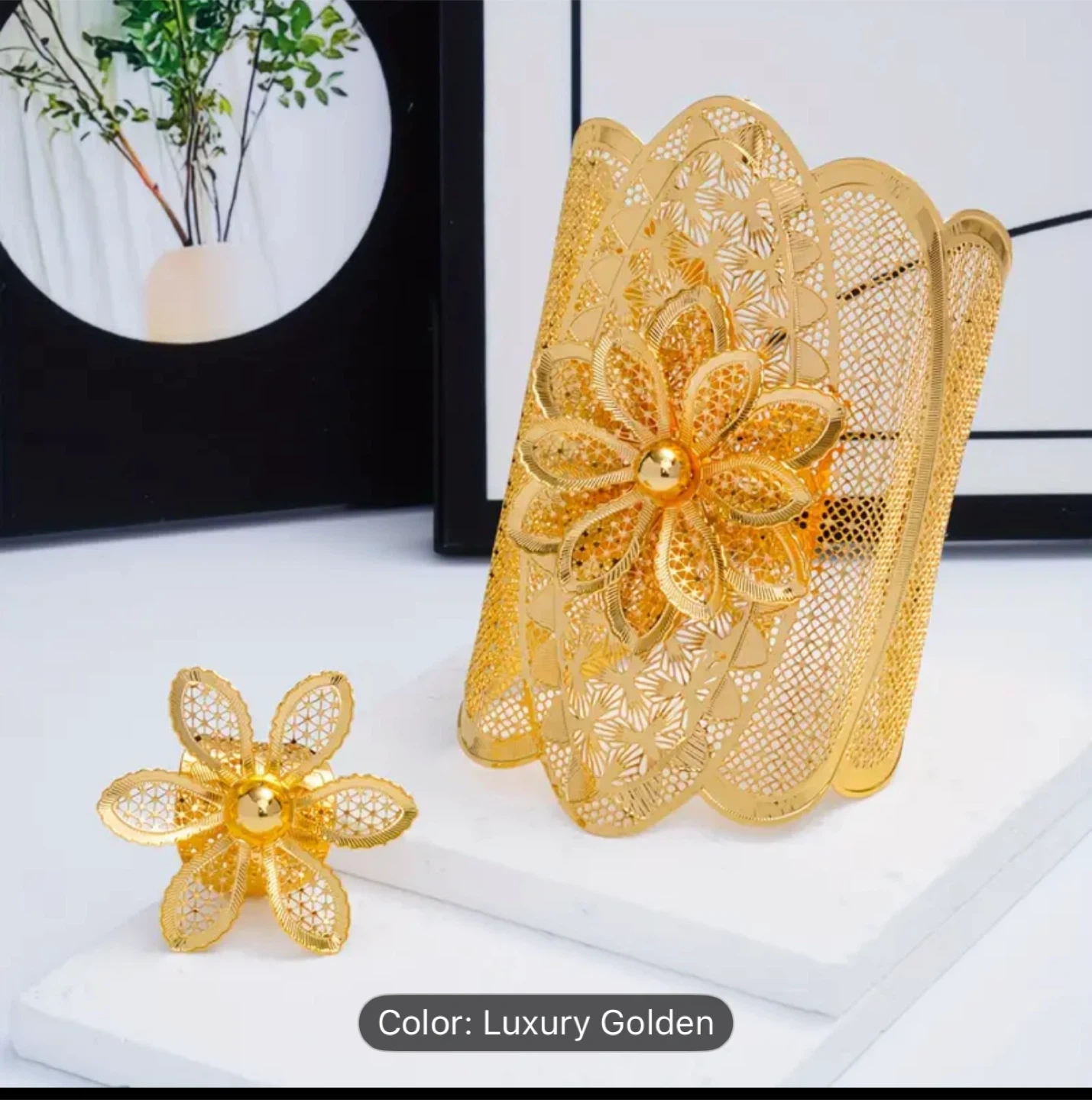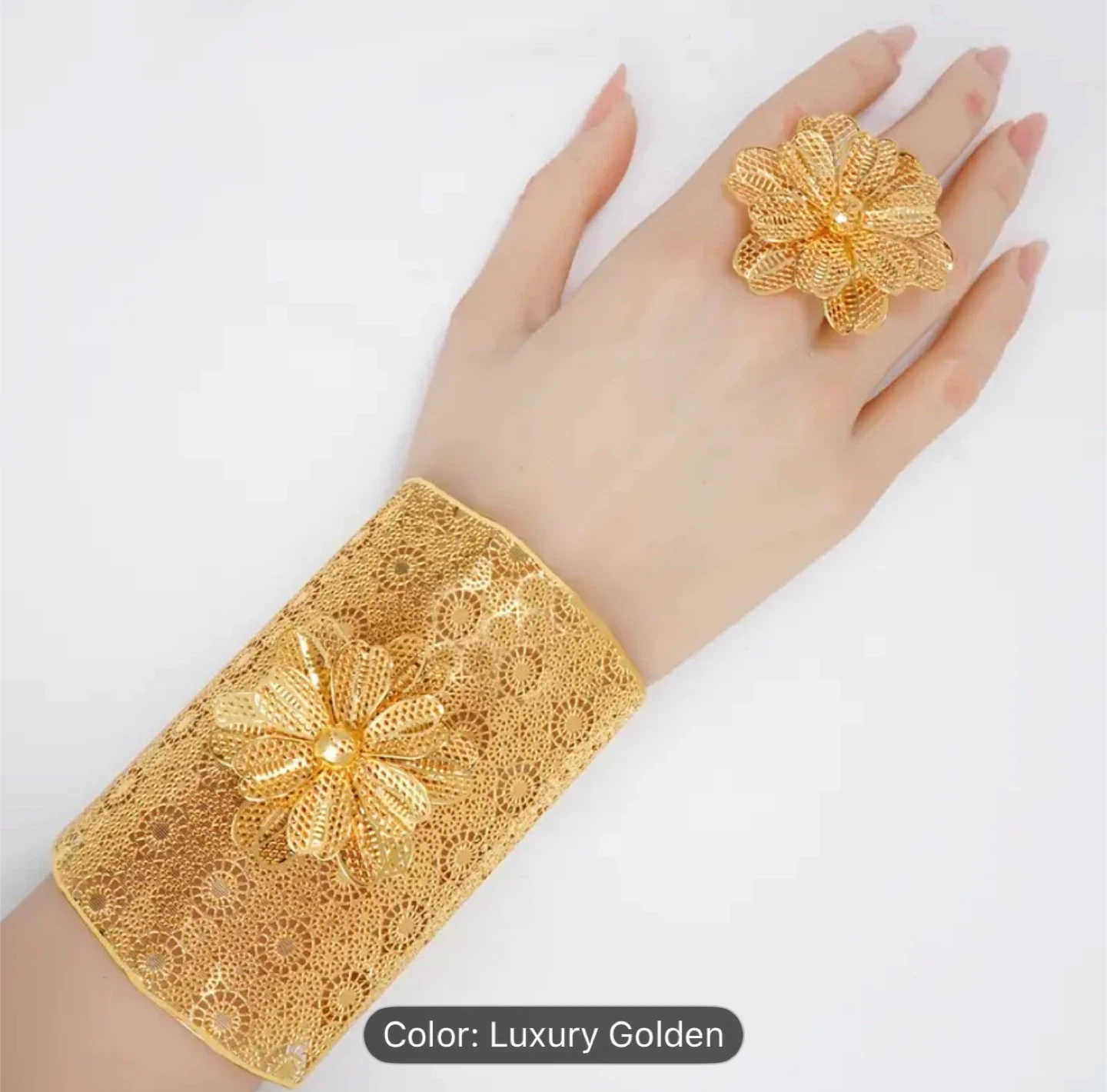 Beautiful luxury golden flower cuff bracelet and ring set.