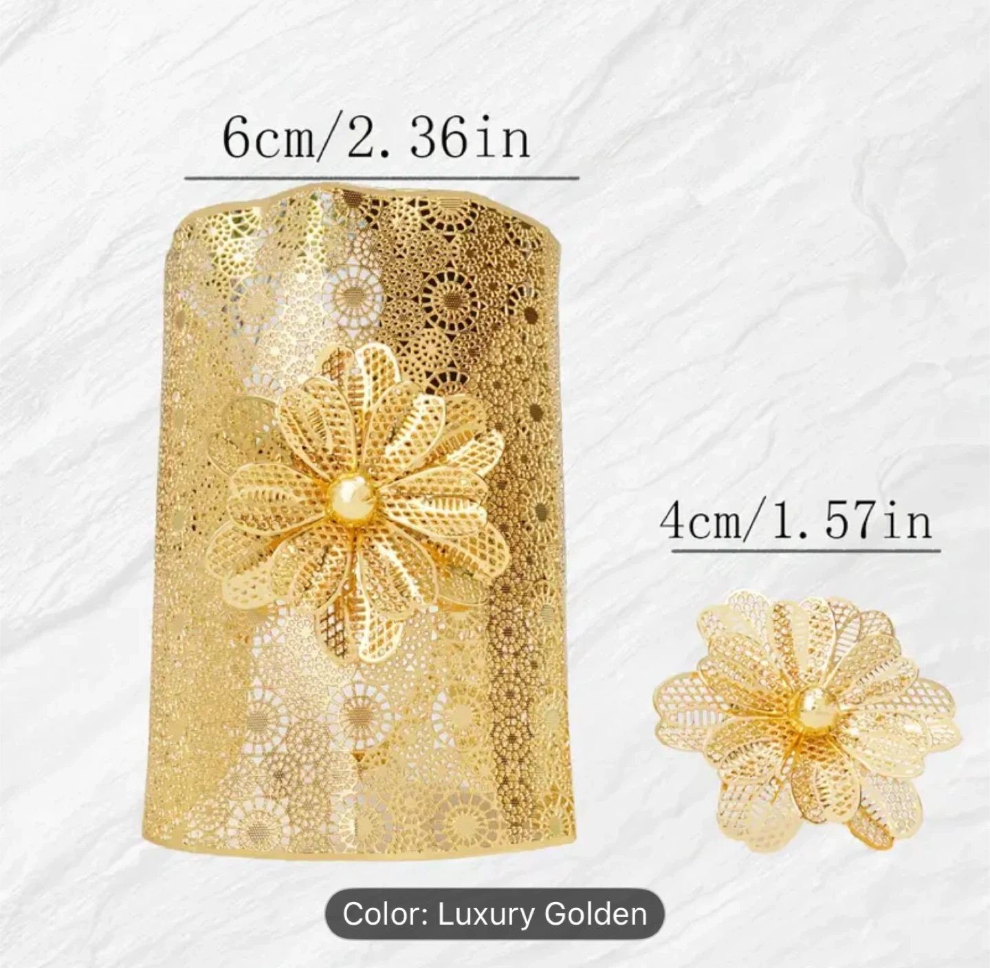 The bracelet is approximately 6cm/2.36in in height, and the ring is about 4cm/1.57in in diameter.