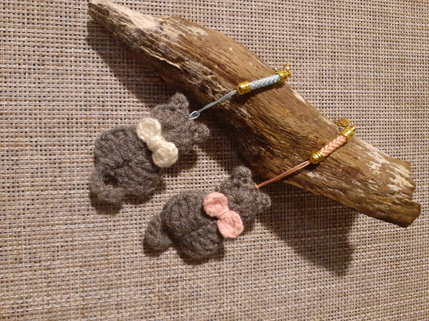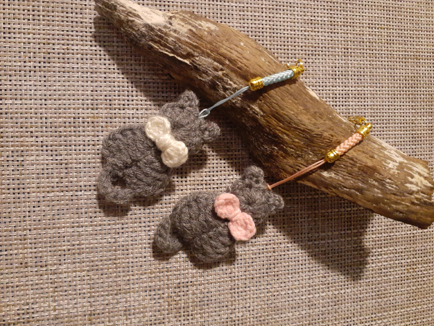 These are two adorable handmade knitted cat charms! They each have a little bow tie, one in white and the other in pink. Perfect for adding a touch of cuteness to your keys, bag, or anywhere you like. $7 ea. or both for for $12