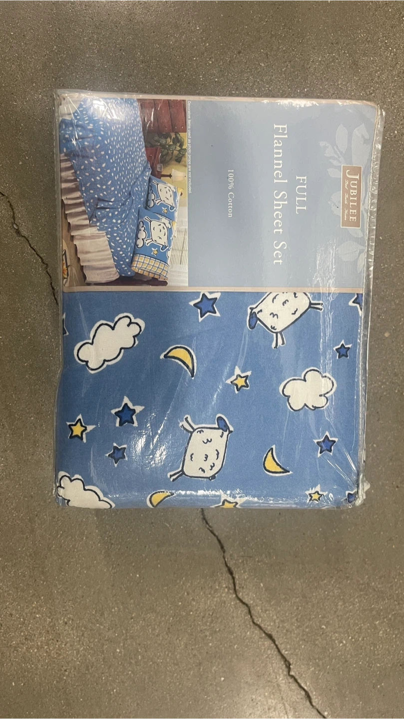 Selling a brand new Jubilee Flannel Full Sheet Set! The set features a cute sheep, cloud, and star pattern on a blue background. It's made of 100% cotton and is still in its original packaging