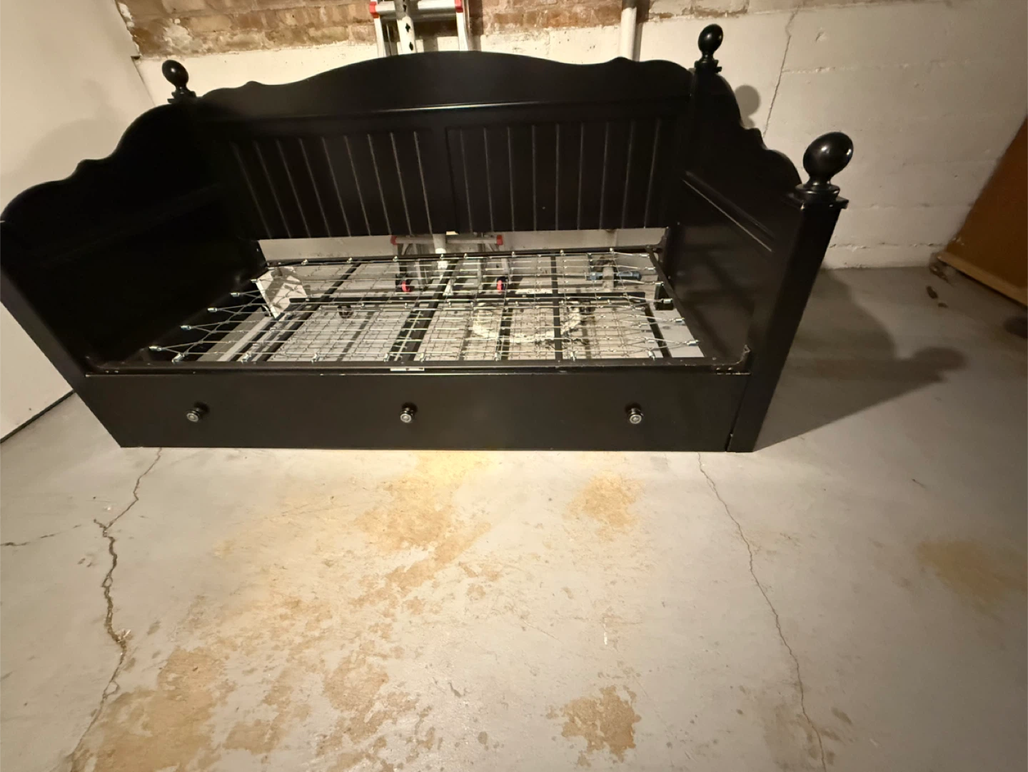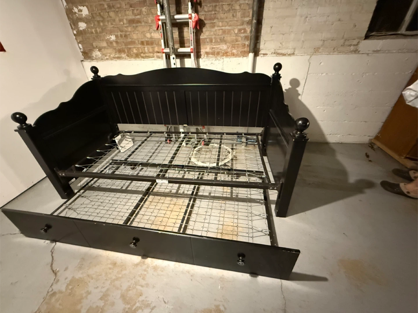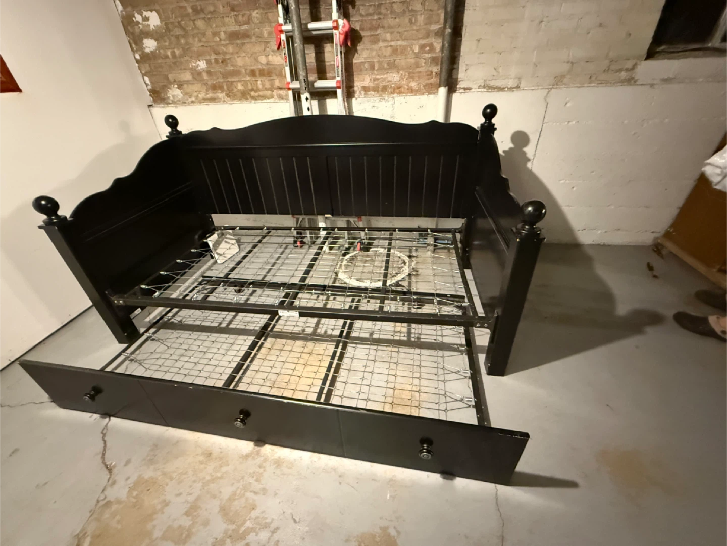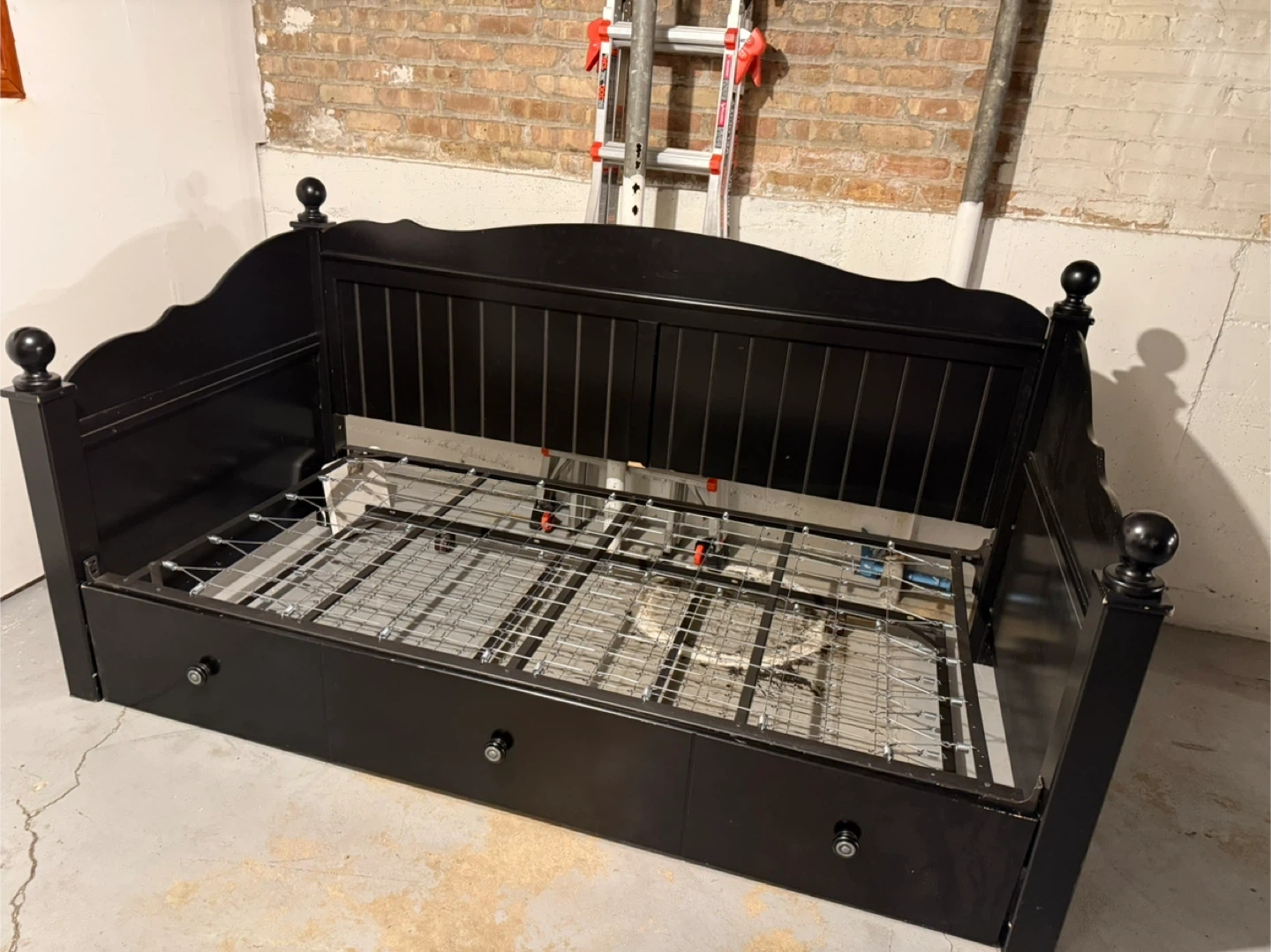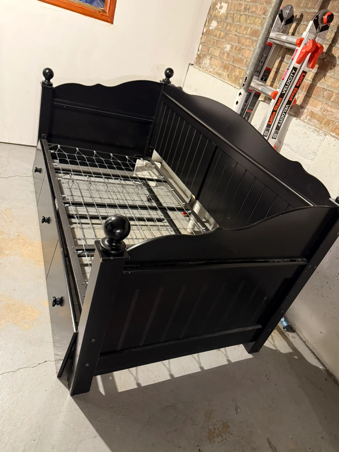 In good condition twin bed with mattress storage with wheels easy to pull out the mattress as you see it in the pictures.