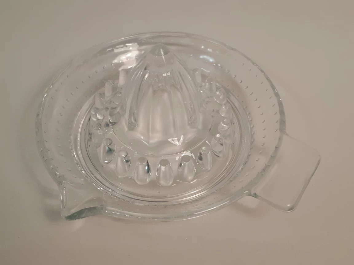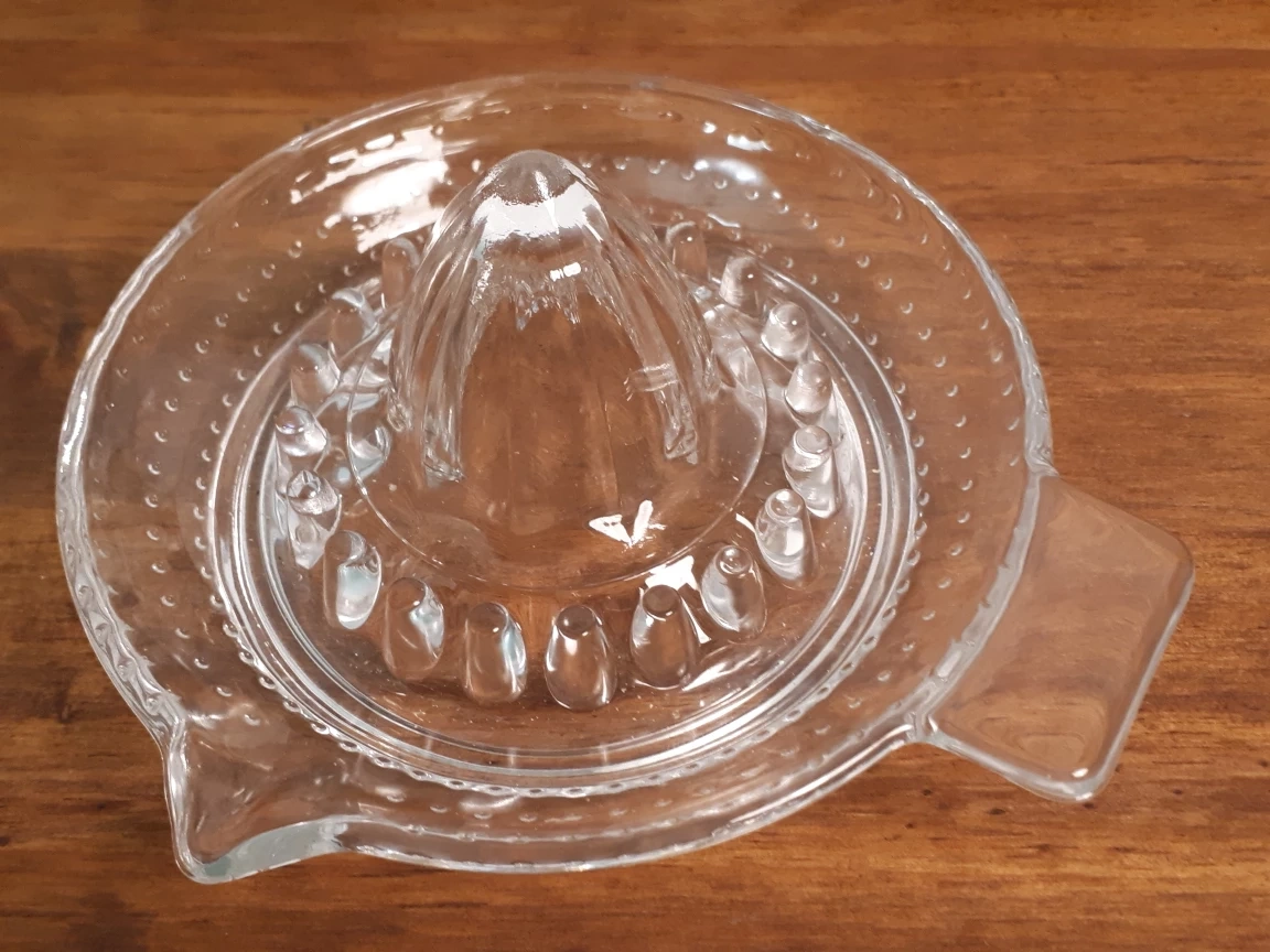 Here's a clear glass lime juicer, perfect for making fresh juice at home! Please note that the reamer is too small to work efficiently on lemons. It's in "almost new" condition and ready to help you squeeze limes with ease.