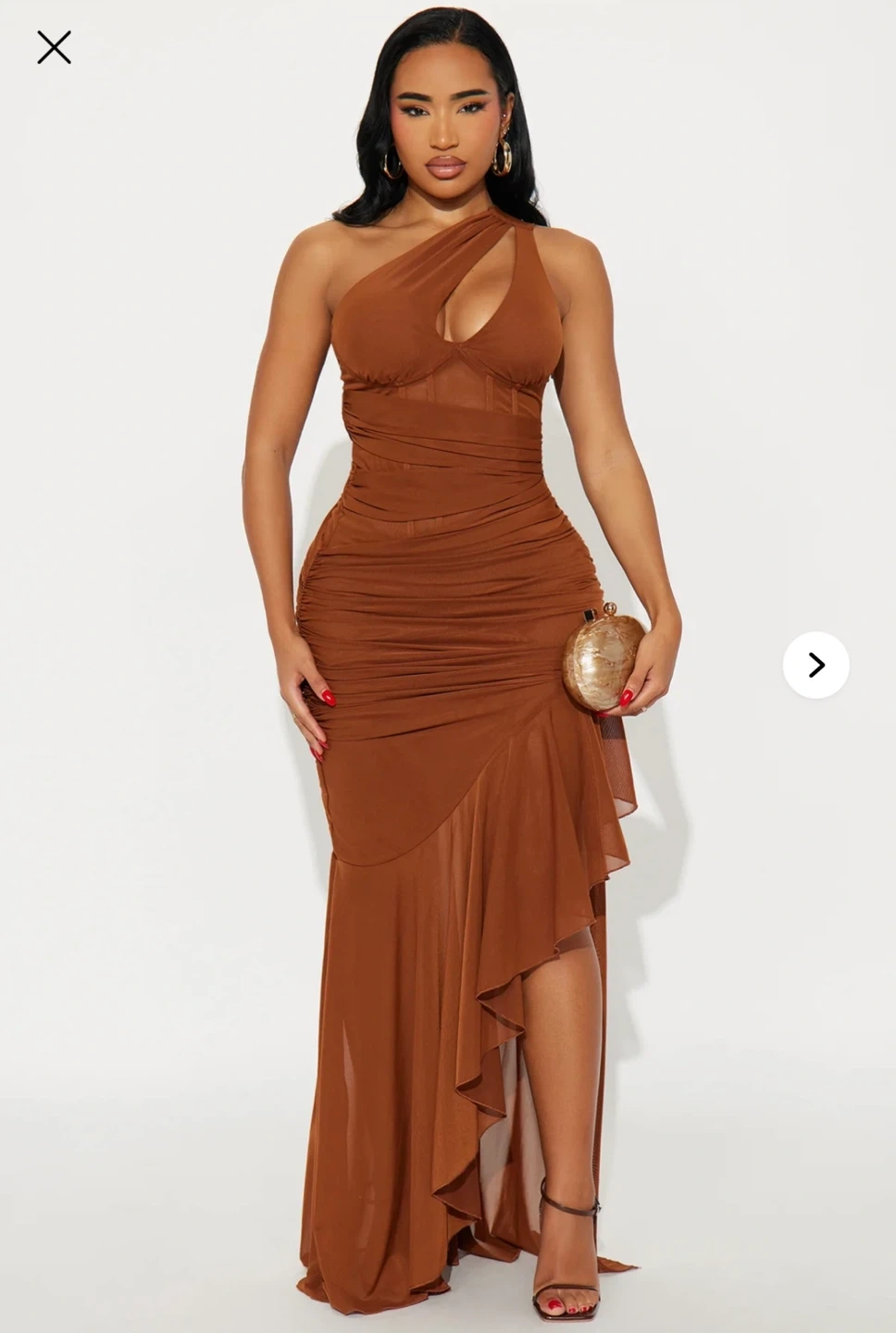 Selling a beautiful brown maxi dress. It features a one-shoulder design and a stylish ruffle detail. Perfect for a special occasion from fashion, nova brand new style sold out online size large fits like a medium