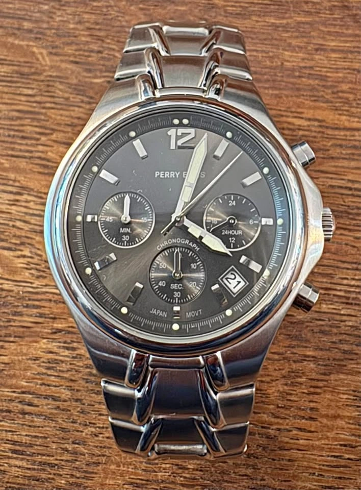 Perry Ellis chronograph men’s watch. This timepiece features a sleek stainless steel bracelet and case, a grey dial with luminous markers, and multiple sub-dials for chronograph and 24-hour functions.