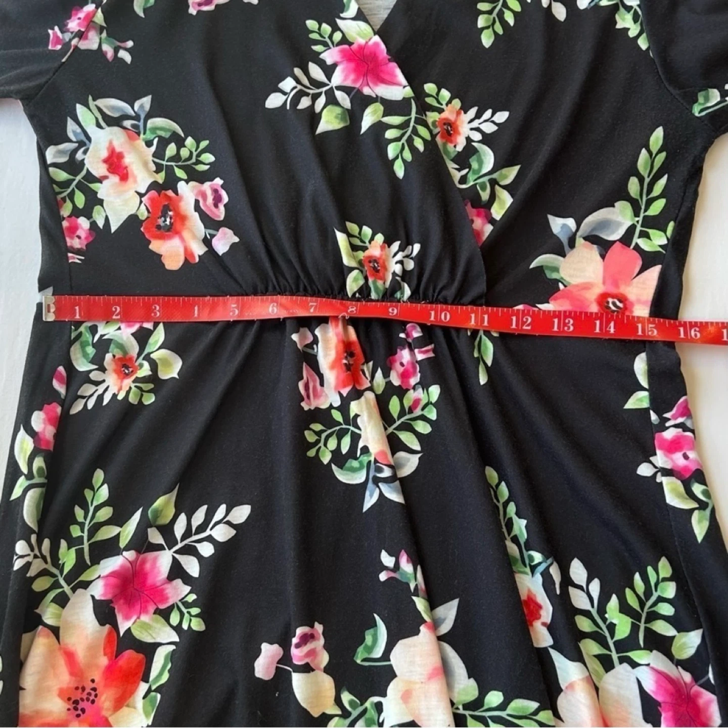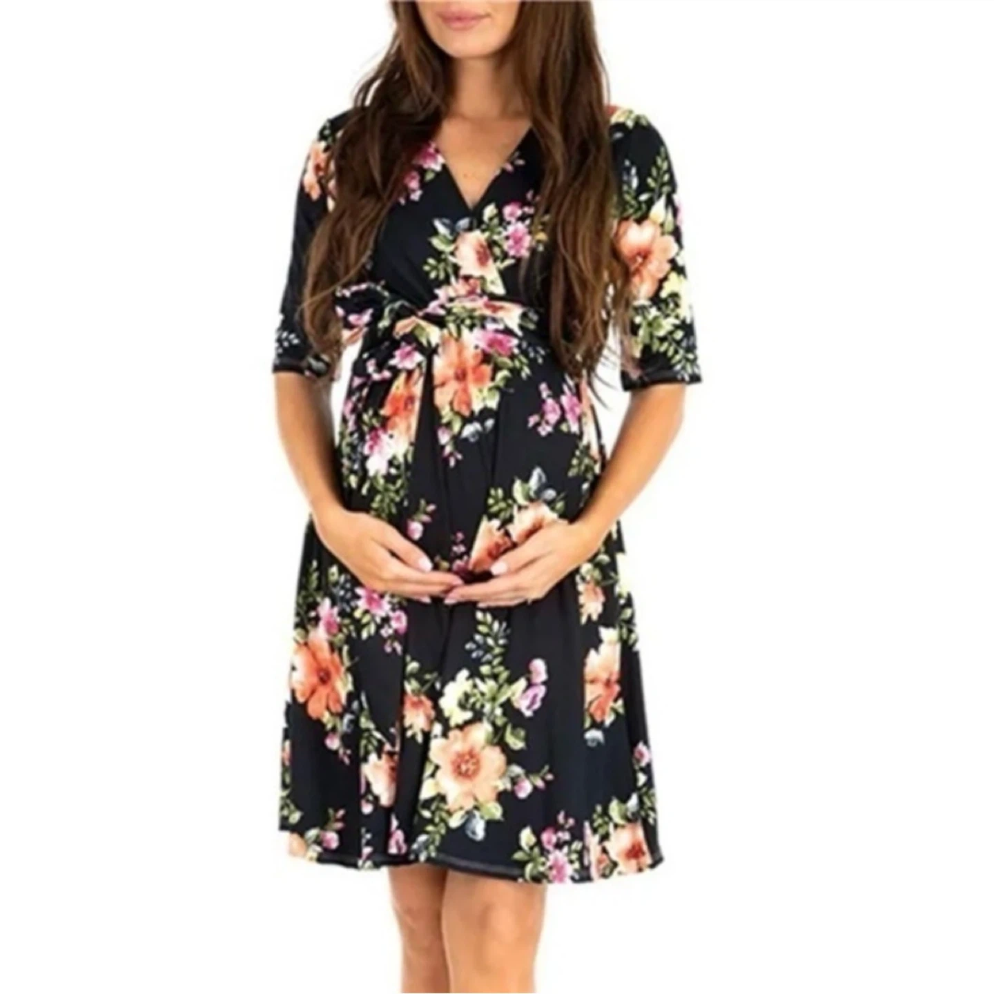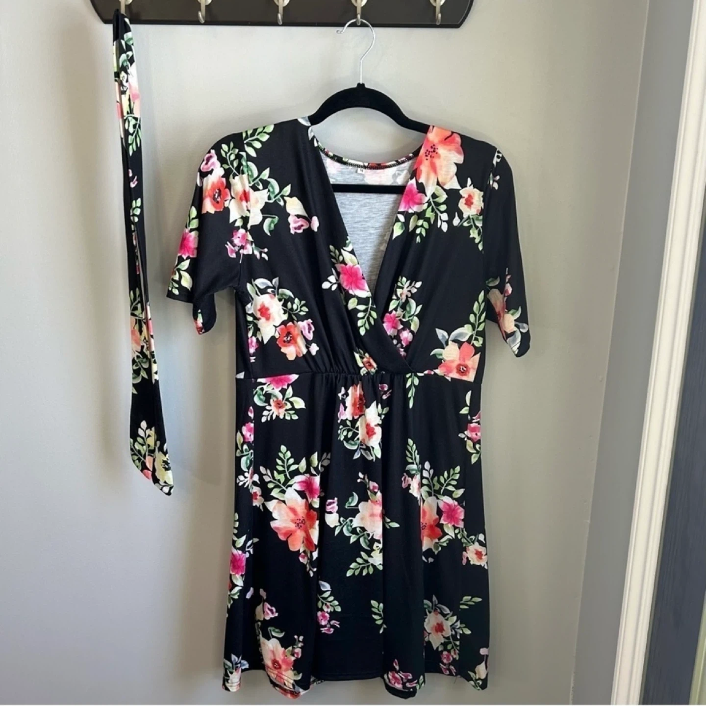 Black with pink & green floral print maternity dress from PatPat. Faux wrap style with removable belt. 1/2 sleeves. Can be worn as non maternity as well. Only worn once. Women’s size M. See photos for measurements. Cross posted.
