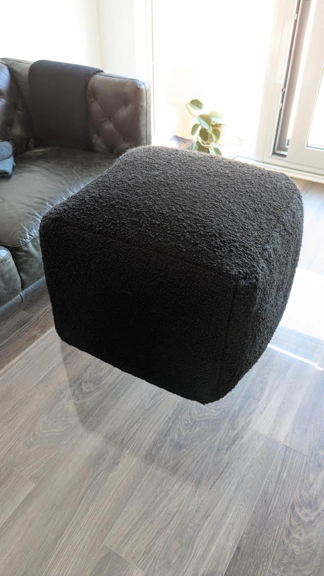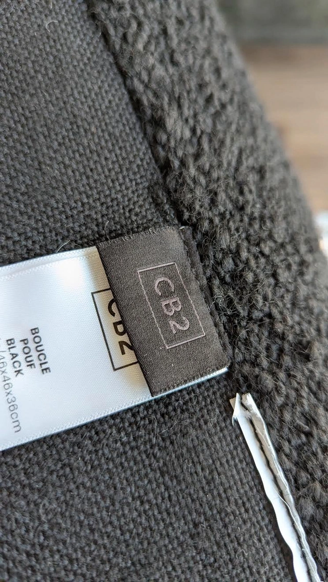 Bought this a few months ago, and am moving. No longer needed. STILL SELLING on CB2 website for $289 plus taxes and shipping. Cute extra seat - great for small spaces. This is in "Like New" condition. From the website: Boucle black pouf is woven of recycled yarn with a technique that takes up to five hours to complete. Each piece will be unique and feel artisanal in nature, with a texture that mirrors our favourite boucles. CB2 exclusive. Pick-up only near College/Bathurst Black Boucle Pouf 14"H 18"W 18"D