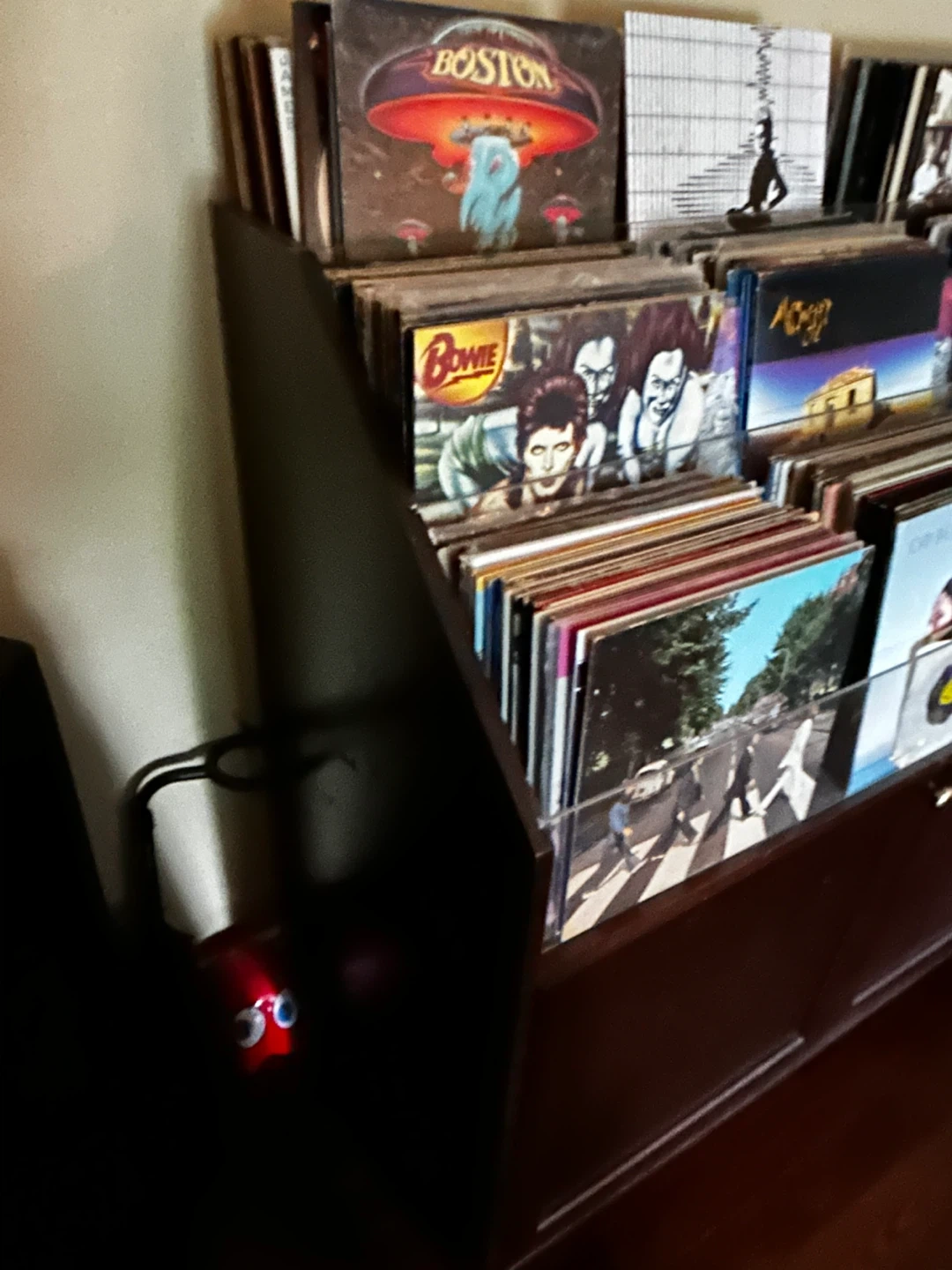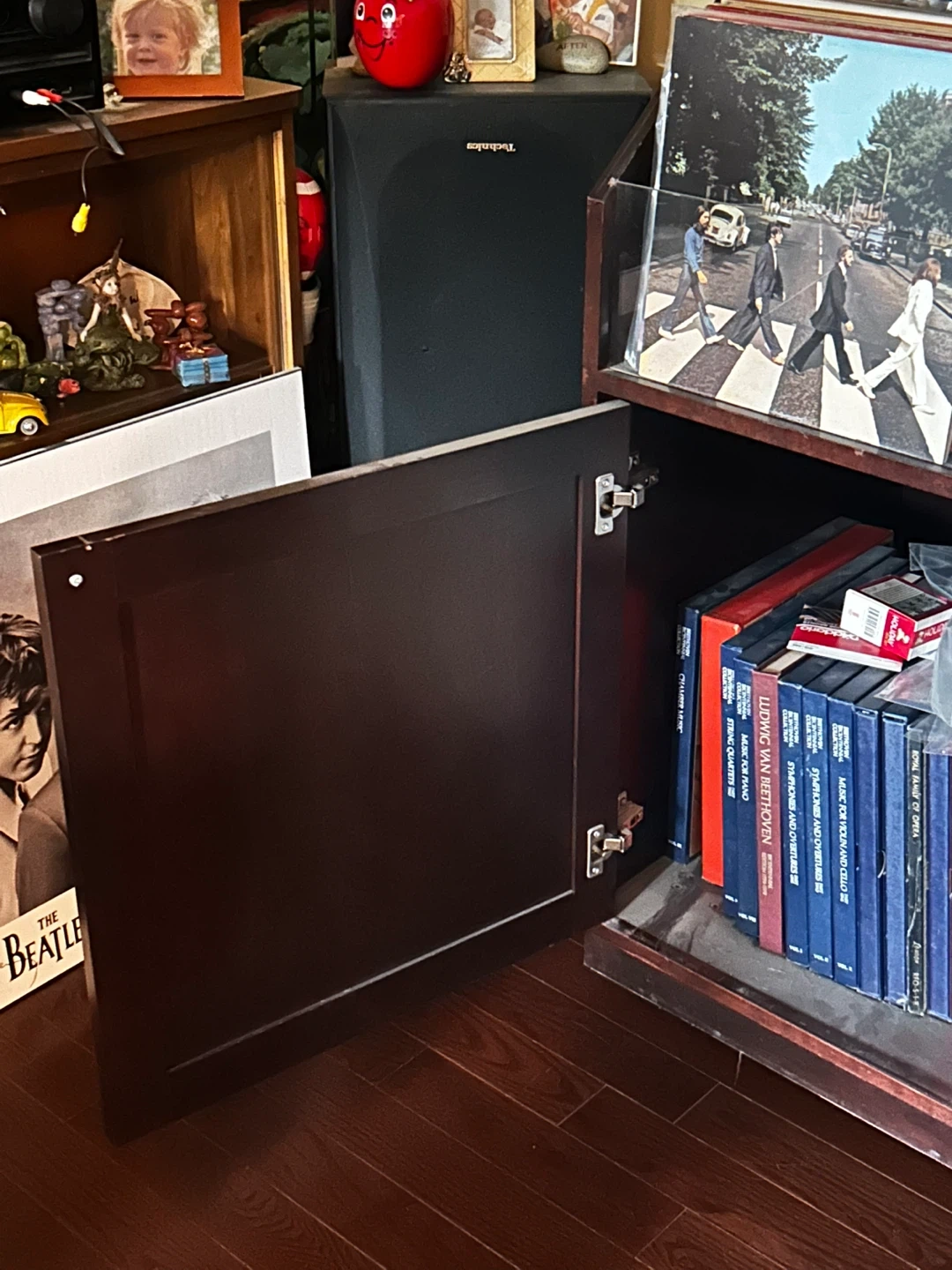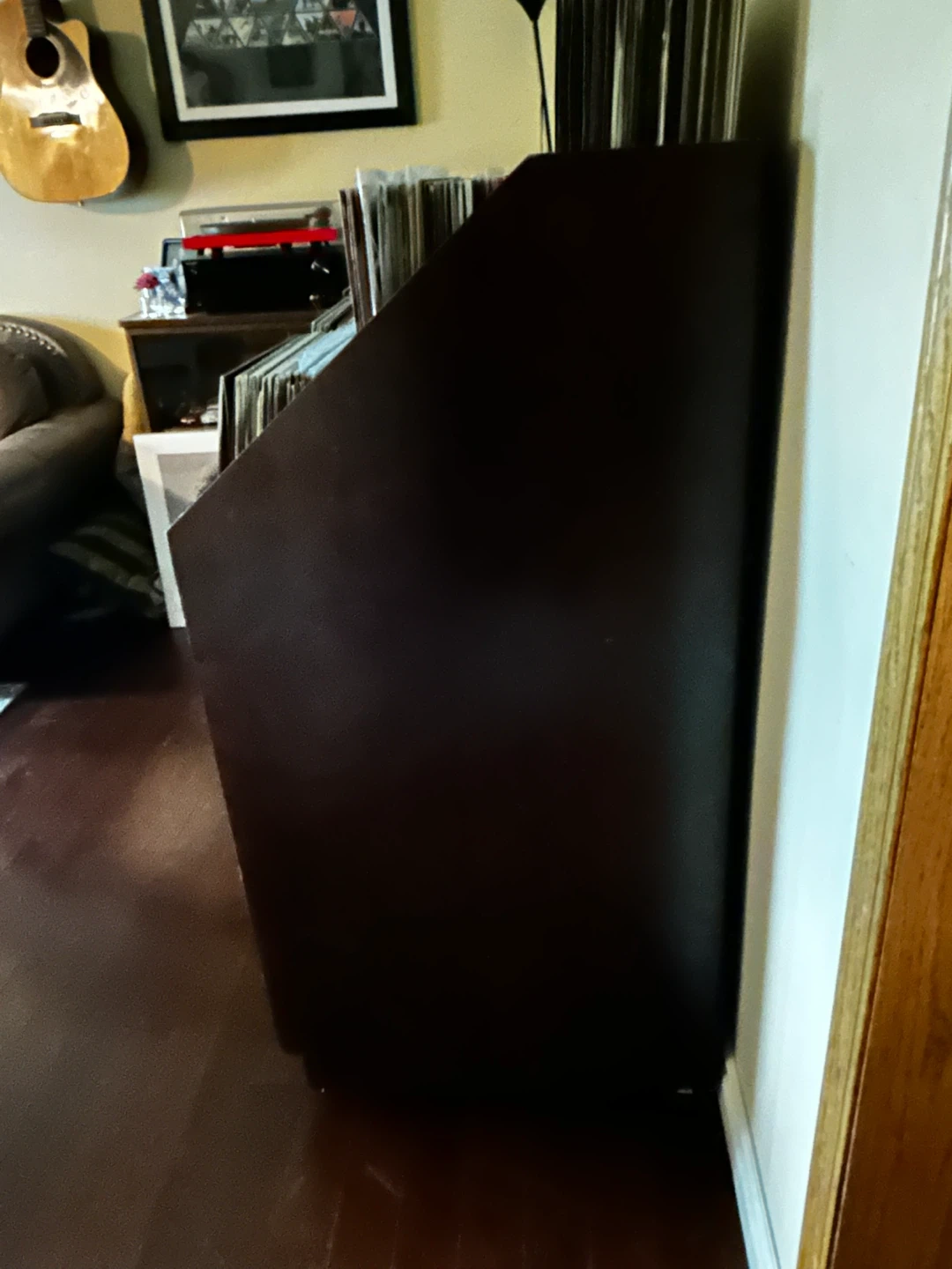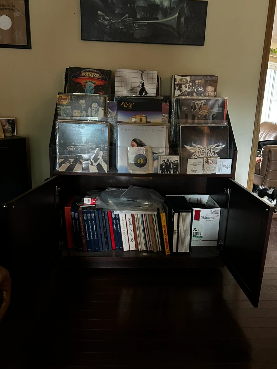 Selling a dark brown media cabinet, perfect for storing your vinyl records. The cabinet features doors for concealed storage and an open top section for displaying your favourite albums. I believed it was originally used to display comic books. The inserts in between each level are plastic, but a hard plastic. It's in great condition and ready for a new home!