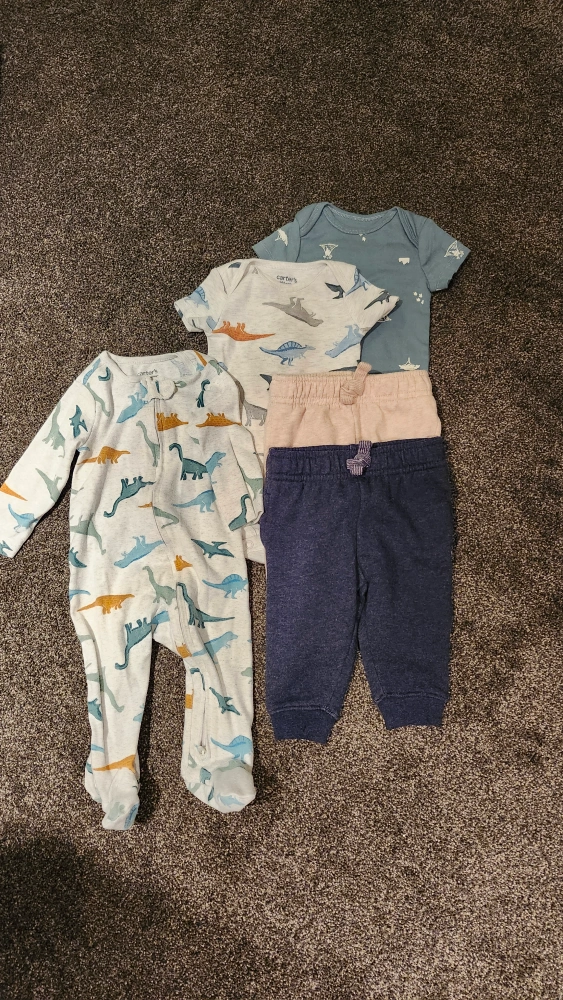 Selling a cute bundle of baby clothes Includes: - 2 short-sleeved bodysuits with fun prints - 1 long-sleeved footed pajama with a dinosaur pattern - 2 pairs of comfy pants All items are size 3-6 months and in great condition. most items only washed not worn