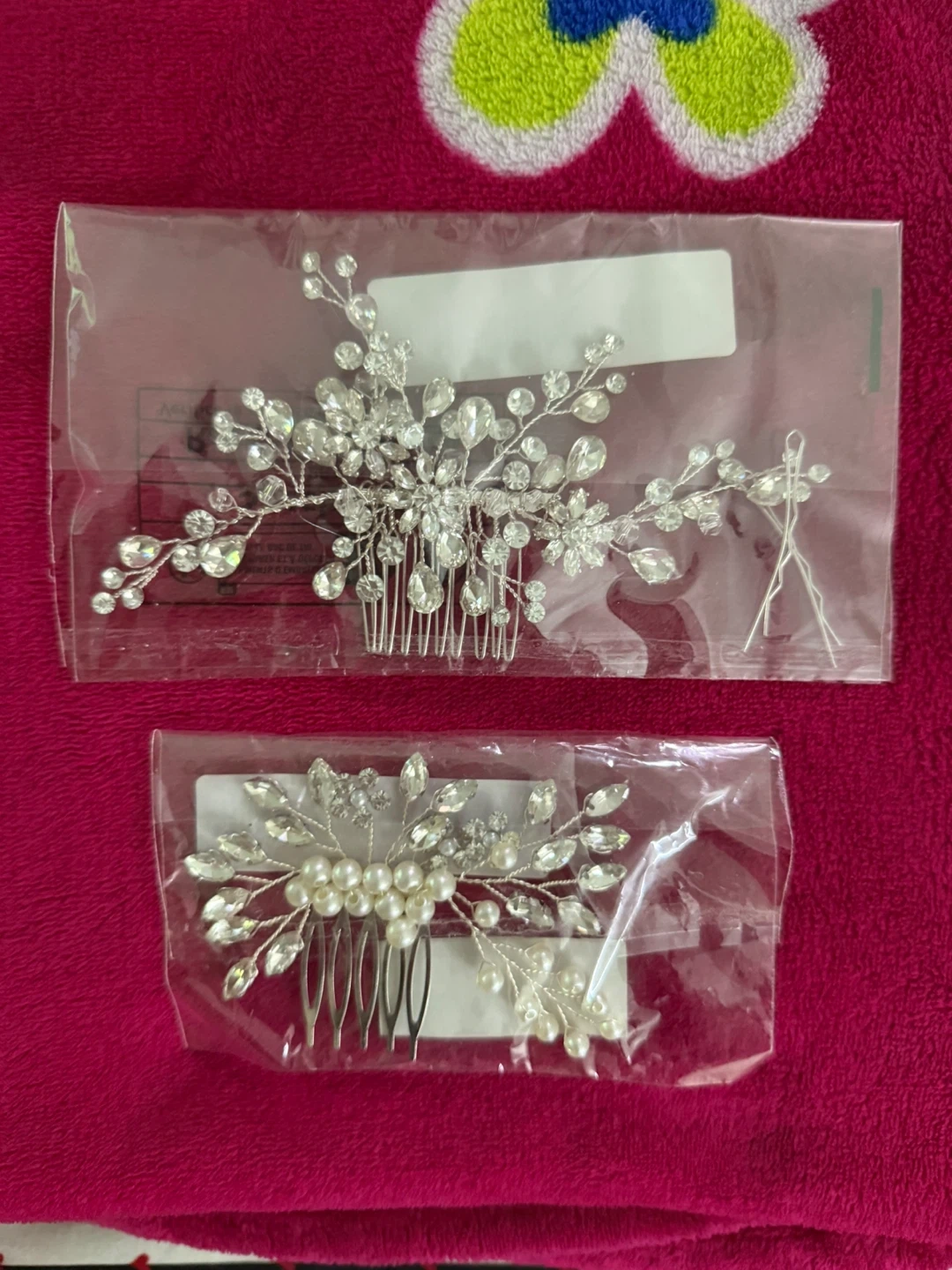 Selling a beautiful silver hair comb set! Perfect for weddings or special occasions. The set includes two combs with crystal and pearl embellishments. They come in their original packaging and are in excellent condition