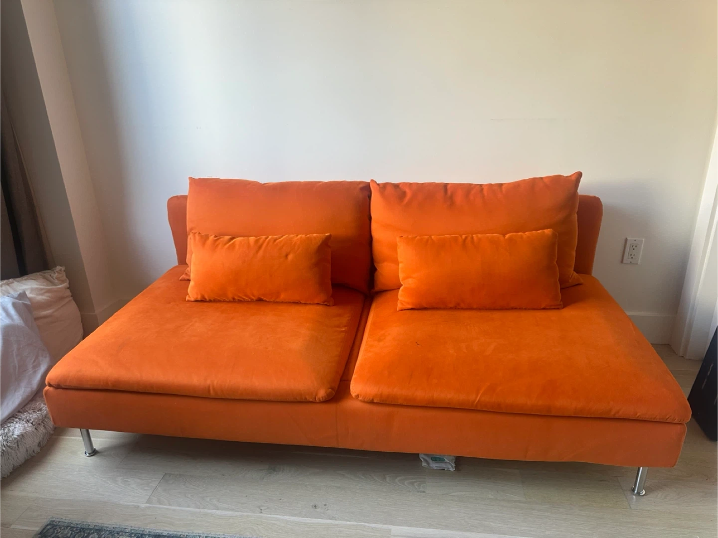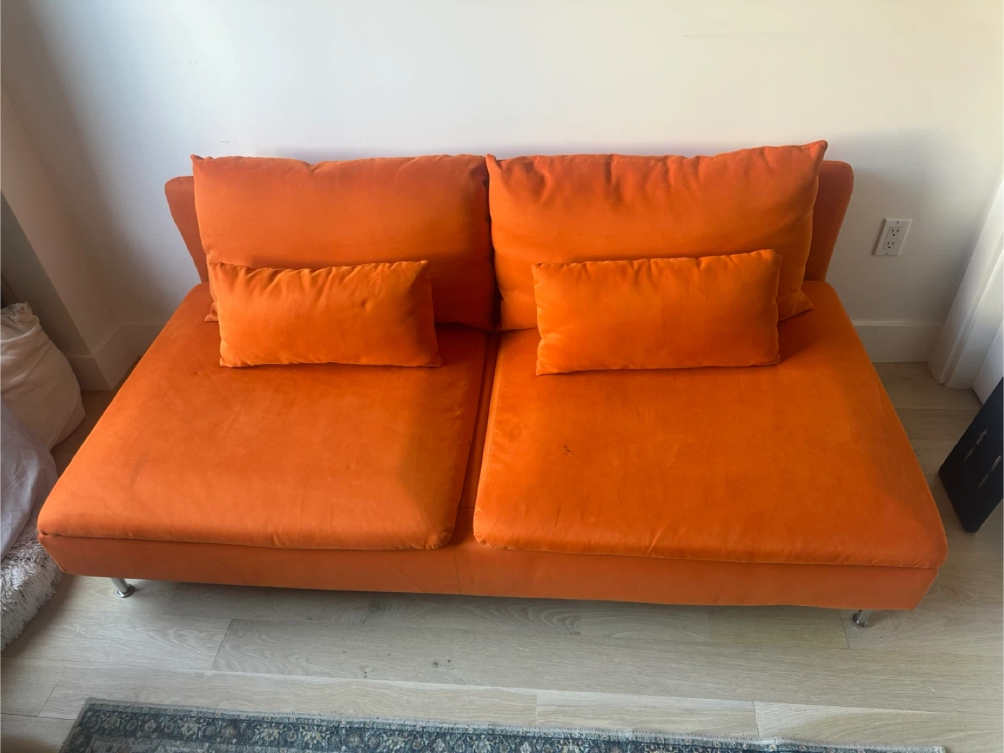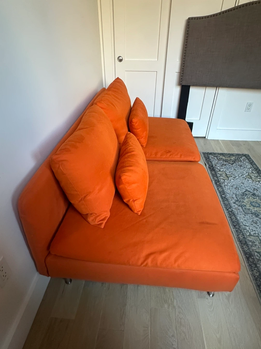 Selling a deep-seated, comfortable orange IKEA sofa, part of the Soderhamn series, that comes with matching pillows. The color is a vibrant orange that can brighten up any room! IKEA also sells covers for this couch model, so you could also completely change the color or pattern. It is also modular so you can buy more parts to make it longer, add a chaise lounge, or add arms! It also makes a great daybed — it is about the width and length of a twin bed when you remove the pillows. Width: 186 cm (73 1/4 ") Depth: 99 cm (39 ") Height: 83 cm (32 5/8 ") Originally $690 on ikea.com https://www.ikea.com/ca/en/p/soederhamn-sofa-section-fridtuna-light-beige-s59449644/#content