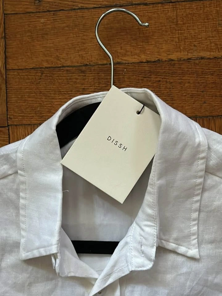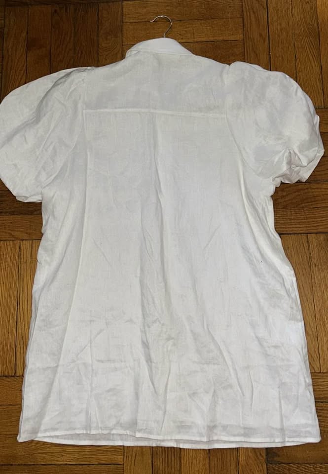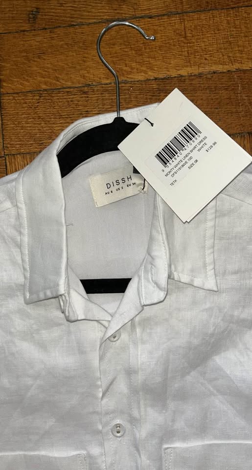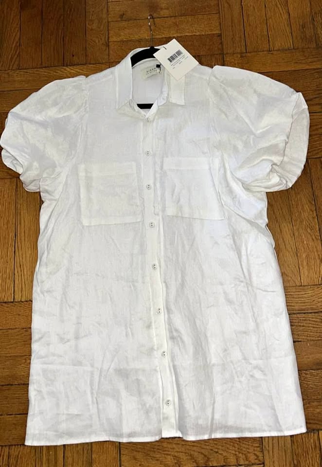 This is a gorgeous white, brand new 100% linen shirt dress from DISSH. New with tags. Original MSRP $129.99. Puffy elasticized, short sleeves. Wear it belted, over pants, or on its own. Pick up on the upper west side of Manhattan.