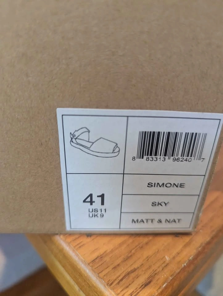 New in box Matt and Nat espadrille style sandals. Colour: Sky. Size: 41