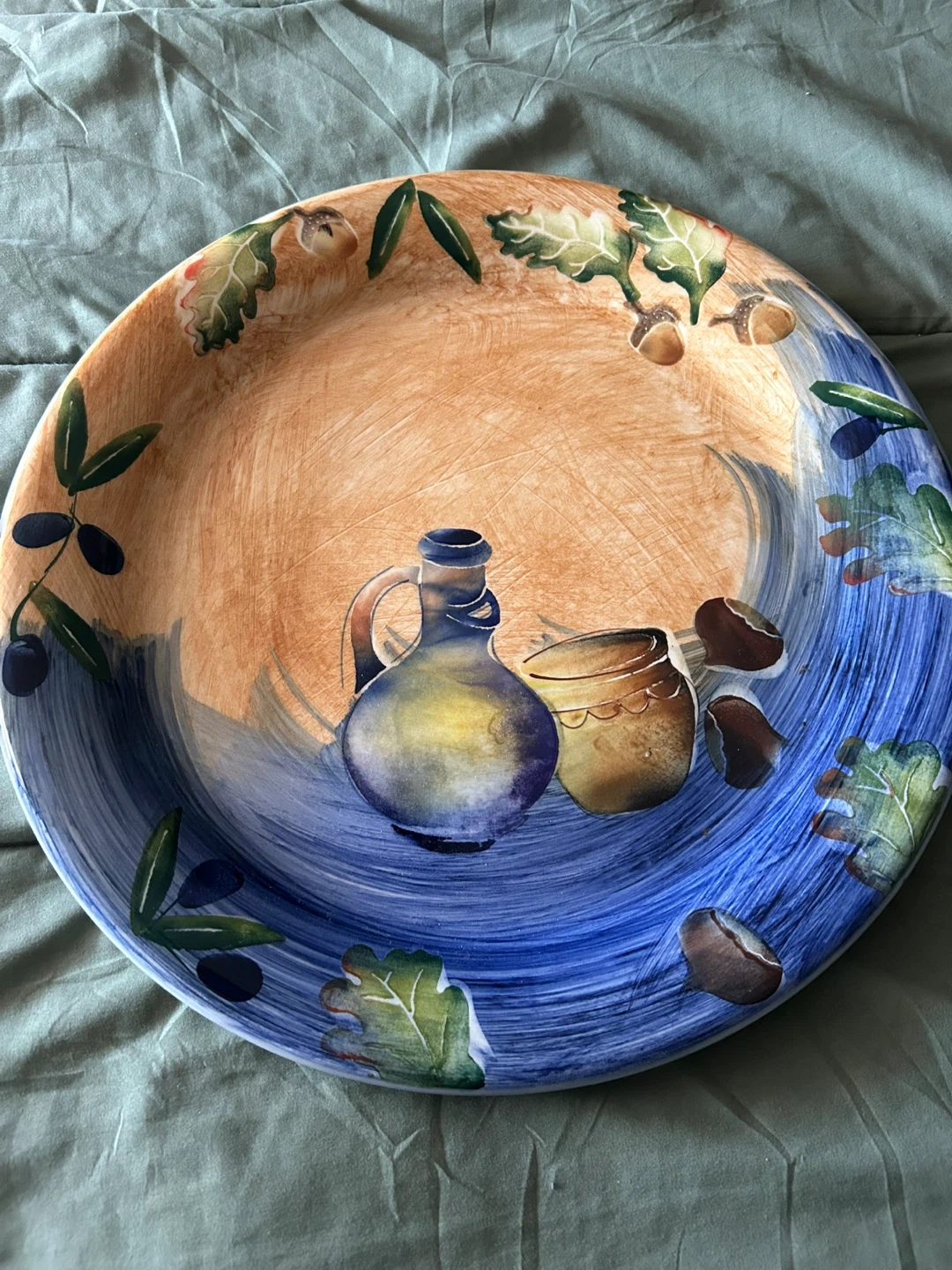 Selling a extract large hand painted Vietri platter ,made in Italy. It has a beautiful design with an olive oil pitcher and leaves. There is a small chip on the edge on the bottom, cannot notice it unless you flip over the platter. See last photo .