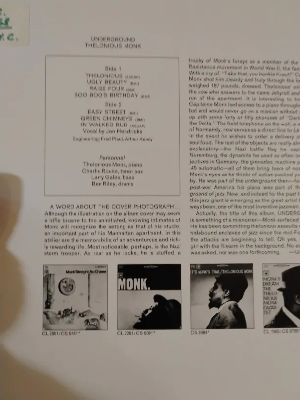 Selling a Thelonious Monk vinyl record, titled "Underground"! This record features tracks like Thelonious, Ugly Beauty, and Easy Street. A great addition for any jazz enthusiast!